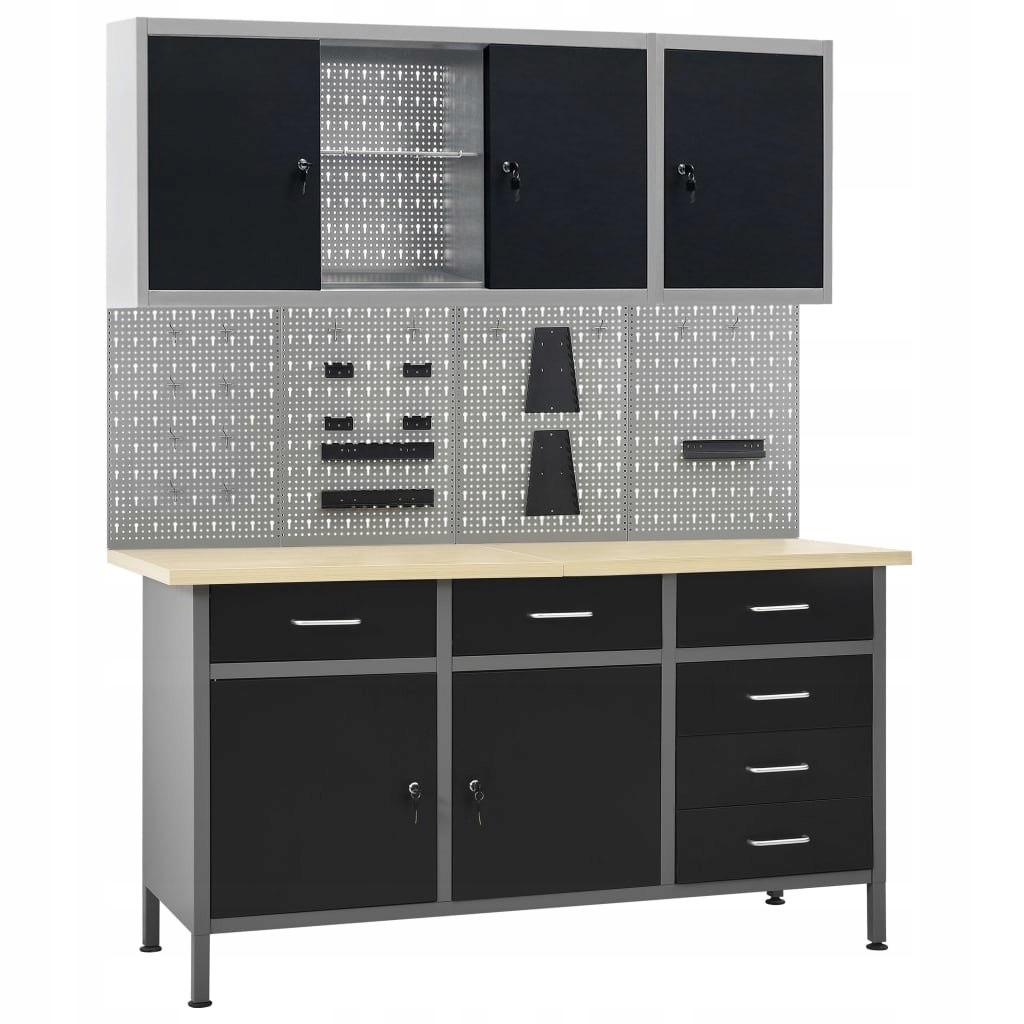Цей набір поєднує в собі 1 верстак, 4 стінові панелі та 2 навісні шафи, забезпечуючи практичне рішення для зберігання в майстерні чи гаражі.