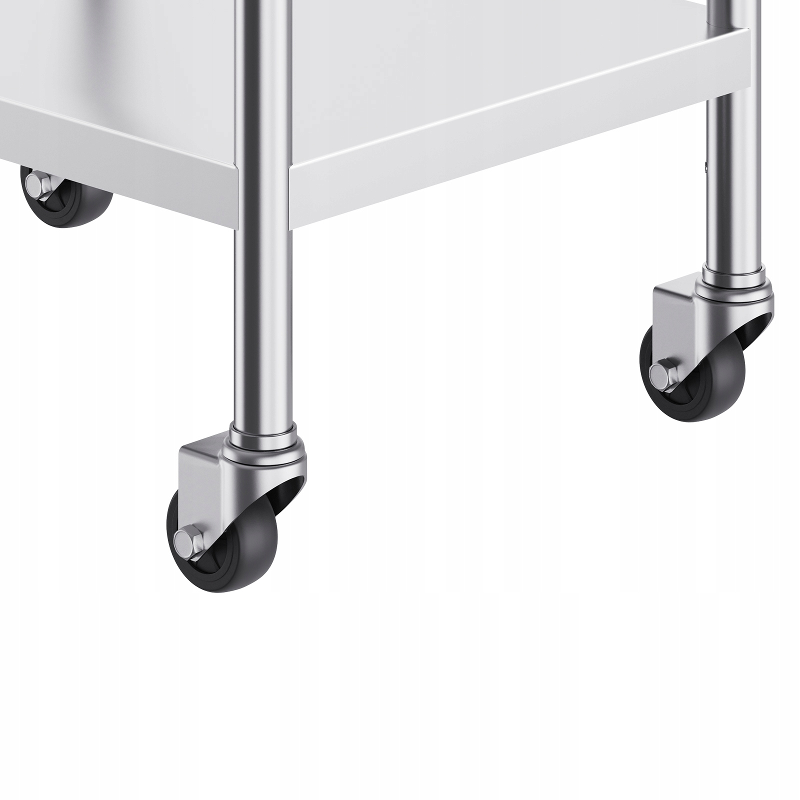 Зручний дизайн: завдяки трирівневим регульованим полицям цей робочий стіл пропонує найвищу функціональність і надзвичайно зручний у використанні. Висоту полиць можна легко регулювати за допомогою гвинтів, адаптуючи їх до предметів різного розміру. Оснащений чотирма поворотними коліщатками, включаючи два з гальмами, стіл залишається стабільним і його можна легко перемістити в будь-яке місце. Висока задня панель запобігає падінню предметів і захищає від бризок.