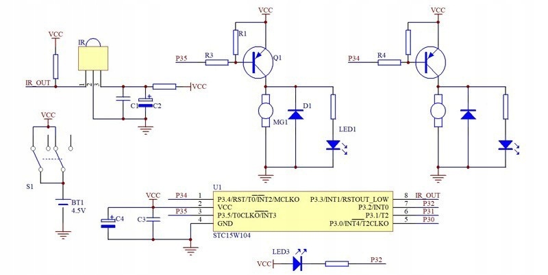 Світлодіод3 на друкованій платі використовується для вказівки стану прийому дистанційного керування. При отриманні сигналу він блимне один раз. LED1 і LED2 вказують на робочий стан двигуна, а їхнє світіння вказує на роботу.