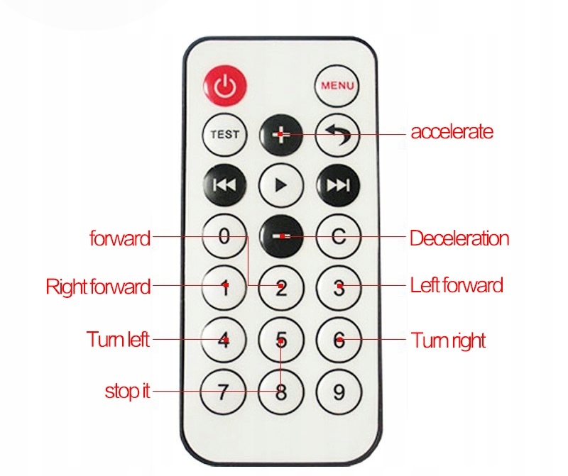 Кнопка з цифрою «2» на пульті дистанційного керування — вперед, «5» — зупинка, «4» — поворот ліворуч, «6» — праворуч, «1» — рух ліворуч, «3» — просування вперед, «прискорення» та ” -” сповільнюється.