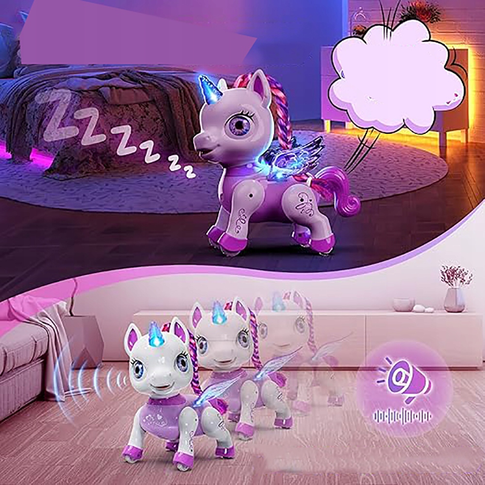 ✨✨✨Чудовий інтерактивний іграшковий робот-єдиноріг. Ця фіолетова електрична іграшка-робот-єдиноріг із дистанційним керуванням для дівчаток має чарівний дизайн і блискучий світлодіодний ріг і крила єдинорога. Він виконує різноманітні веселі рухи, такі як ковзання, біг, повороти, сидіння, стояння та танці - і все це натисканням кнопки. Єдиноріг також грає милу мелодію, яка додає інтерактивності.