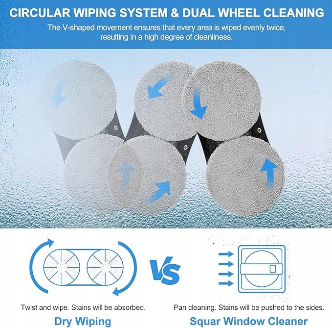 Кругова система протирання концентрує бруд і запобігає притисканню засобу для миття вікон до країв. V-подібний рух забезпечує рівномірне двічі протирання кожної ділянки для максимальної чистоти. Порада: через їх округлу форму кути слід витирати вручну.
