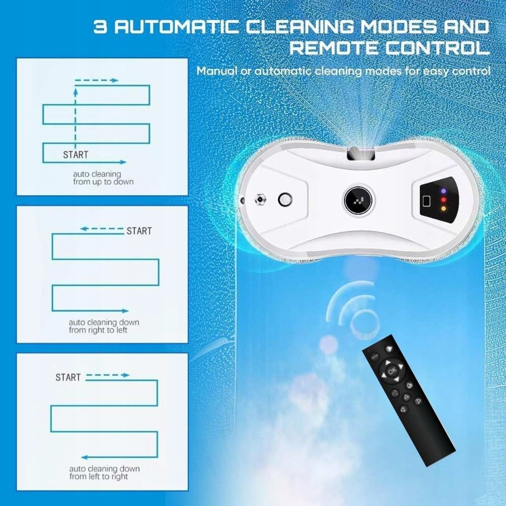 Розумний робот для миття вікон - передовий пристрій, призначений для миття вікон, дзеркал і плитки. Інтегрована високоенергетична односпрямована технологія ультразвукового розпилення води гарантує ефективне очищення, залишаючи поверхні бездоганно чистими та без смуг.