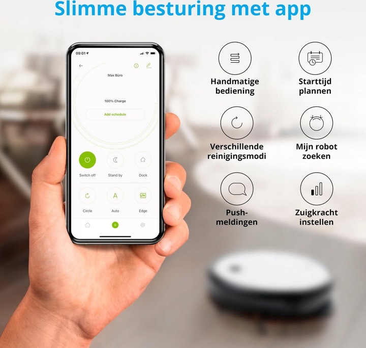 Ви можете легко керувати медіонним роботом із дивана за допомогою програми на телефоні. Наприклад, ви можете доручити робота вакуумувати залишки кухні після приготування їжі або встановити графік на решту тижня. Тут ви вказуєте, коли хочете, щоб робот прибирав, навіть коли ви не вдома. Крім того, ви дотримуєтесь прогресу, відстежуючи в прямому ефірі.