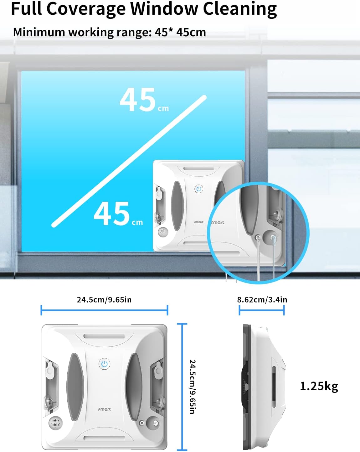 Робот для миття вікон FMART має сильну потужність всмоктування 3800 Па, яка може міцно захопити скло та глибоко очистіть їх.
