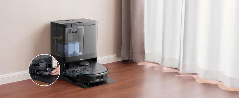 Eufy X10 Pro Omni повертається на станцію, щоб промити мочалки чистою водою. Основу станції All-in-One можна легко від'єднати, що робить прибирання зручним і легким.