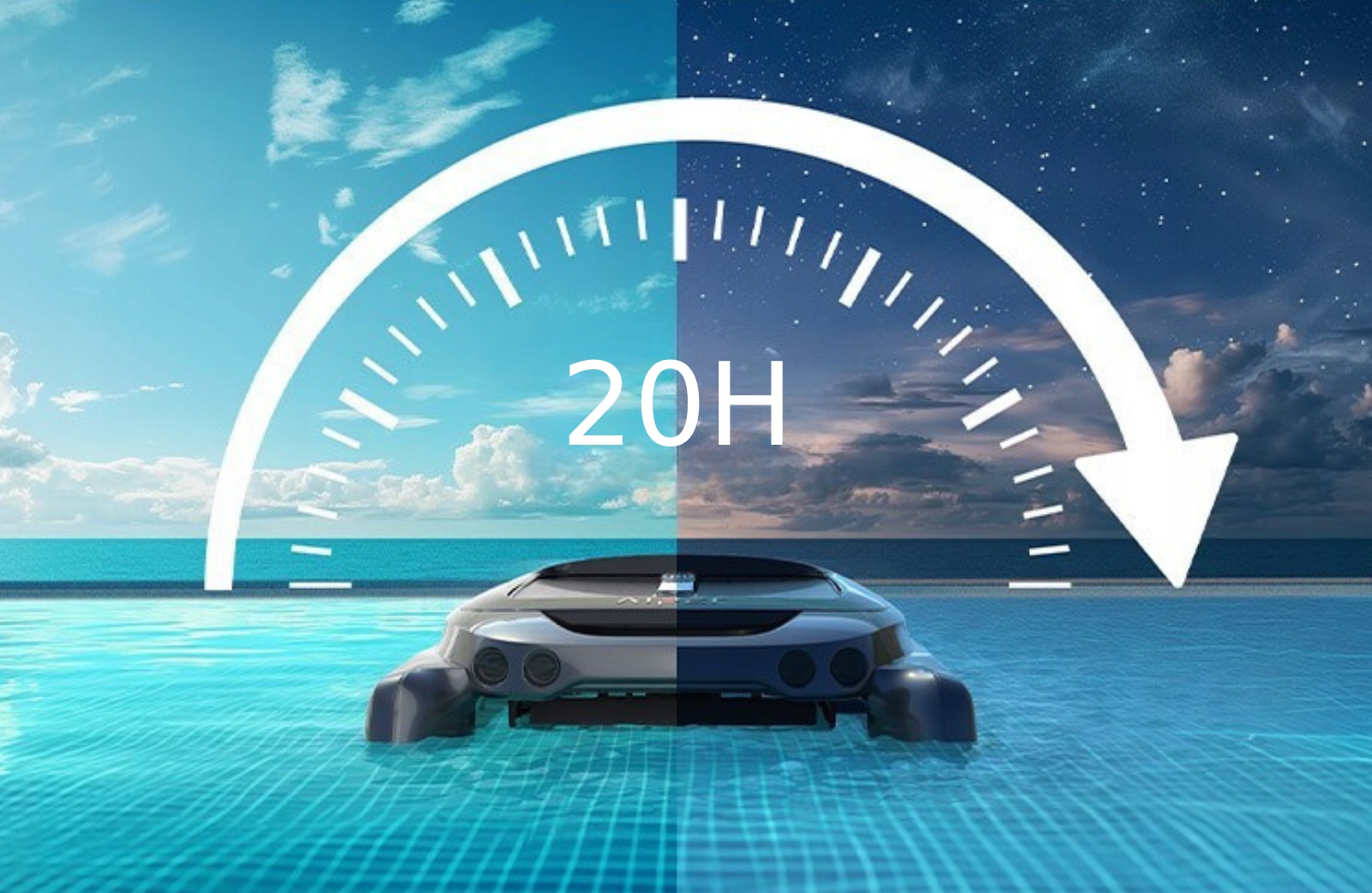Робот може працювати до 20 годин, гарантуючи чисту воду в басейні. Місткий 5-літровий фільтруючий кошик забезпечує збір усіх забруднень під час роботи робота.