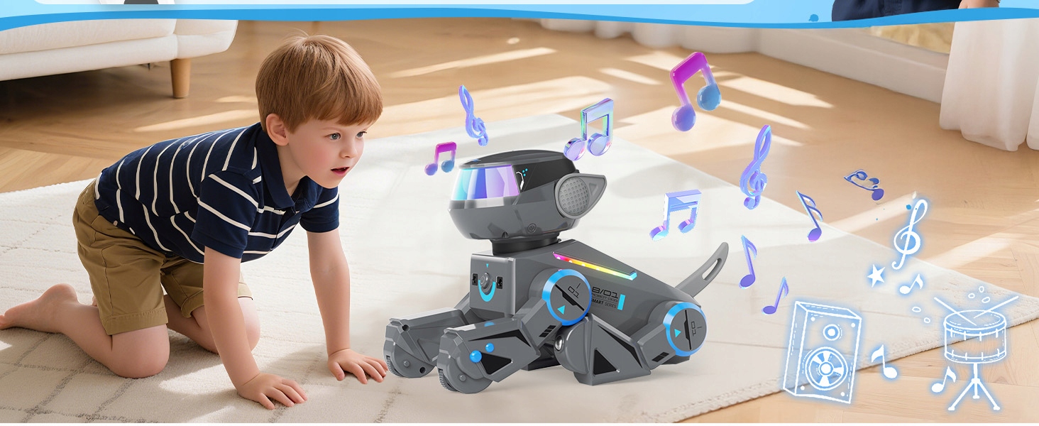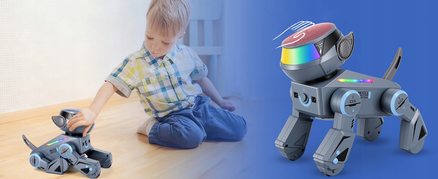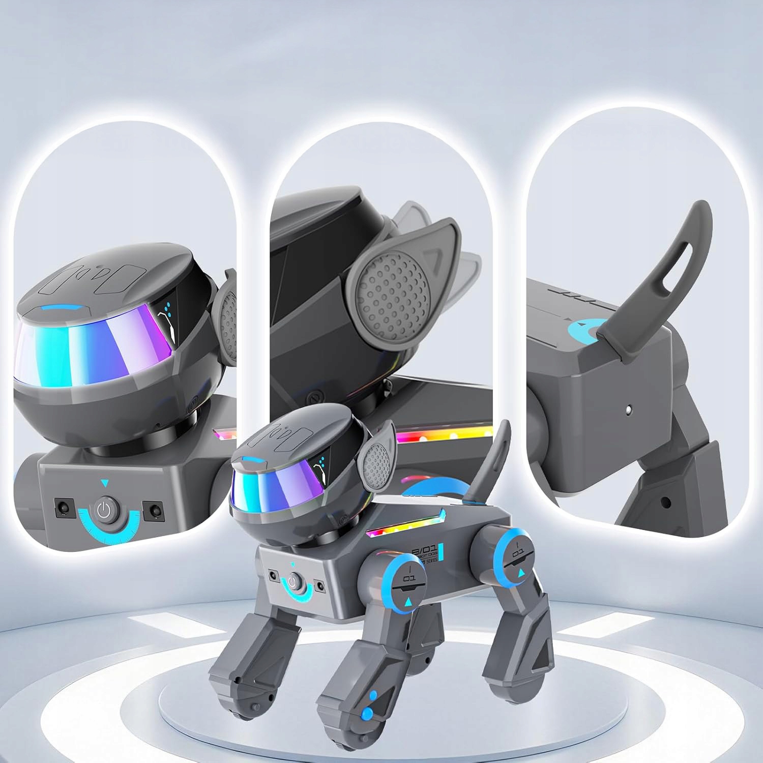 - ✔️Він може виконувати багато реалістичних рухів собаки, як-от вперед і назад, сидіти й сидіти, стояти на руках, віджиматися та вітатися. У режимі танцю або вокалізації він рухається в ритмі музики. Дотик до голови або спини викликає у нього кумедні реакції. Кожен рух супроводжується веселими звуковими ефектами та кольоровими світлодіодними підсвічуваннями.