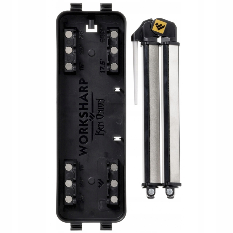 Набір гострого кута роботи -це регульована стояча система , оснащена поворотними діаманто-керамічними стрижнями , що дозволяє заточувати ножі під 5 встановіними кутами .