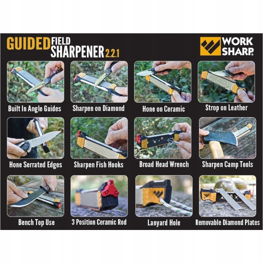 Робота за різкою заточеною точилкою поля - це компактна точилька для ножів та інструментів, що дозволяє повне процес заточення в полі. Невеликі розміри, висока функціональність та ефективність, роблять цю універсальну точину чудовою пропозицією для туристів, мисливців, рибалок та військових! як 5 зон заточування , постійні кутові путівники, ключі від Відкрутіть печери, постріл і відсік для тінда або освітлення. Градація (груба і мала) та функція заточення рибальських гачків,
