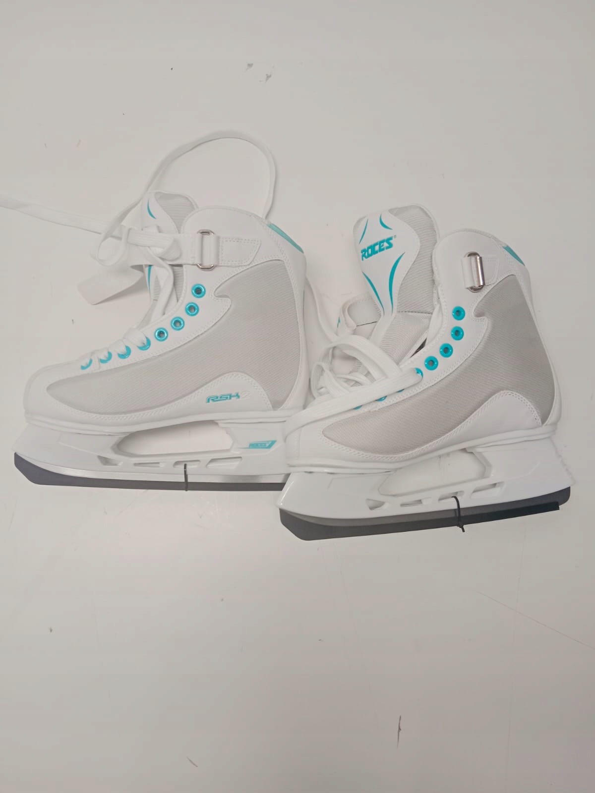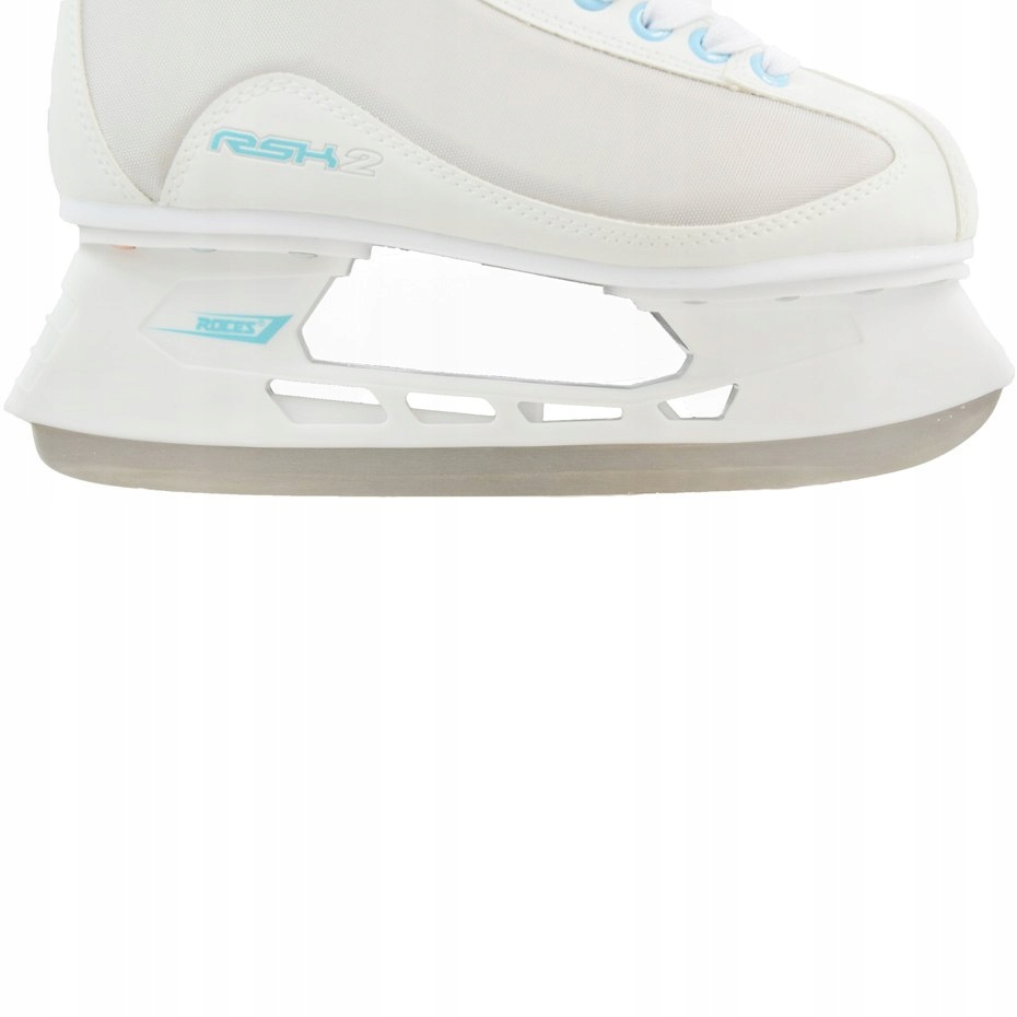 Вічні жіночі спортивні та рекреаційні ковзани в модному хокейному стилі "білого та срібла". Теплоізоляція, водонепроникна та стабільна зовнішня взуття, виготовлена з нейлону та синтетичної шкіри з посиленим пальцем. Внутрішня взуття та язик, особливо для жінок, анатомічно посилені та зручно підкладені. Кріплення за допомогою класичного, зовнішнього хокейного шнурування з 8 очей з білими струнами та бірюзовими війами. Крім того, ремінь на липучках на верхній частині.