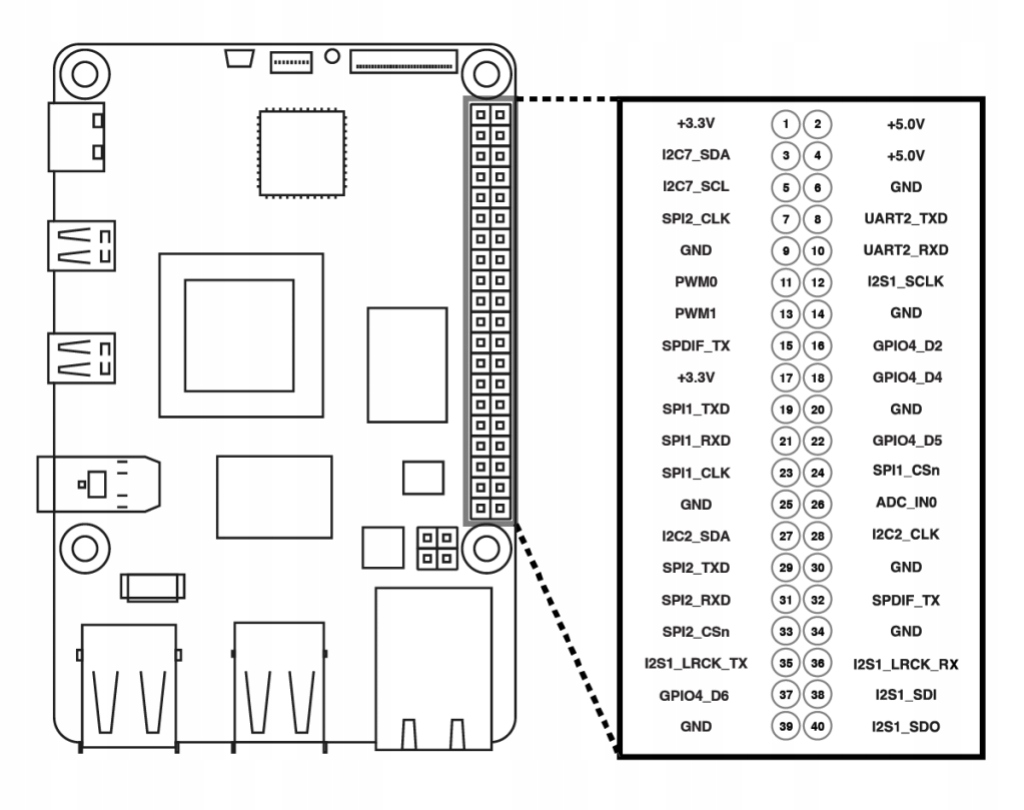 40 x призначених для користувача GPIO з підтримкою широкого діапазону параметрів інтерфейсу : 2 x UART, 2 x шина SPI, 2 x шина I2C, 1 x PCM/I2S, 1 x SPDIF, 1 x PWM, 1 x ADC, 6 x GPIO, 2 x 5 В постійного струму, 2 x 3,3 В живлення . Роз’єм GPIO на 97,5% (39/40) сумісний із Raspberry Pi.