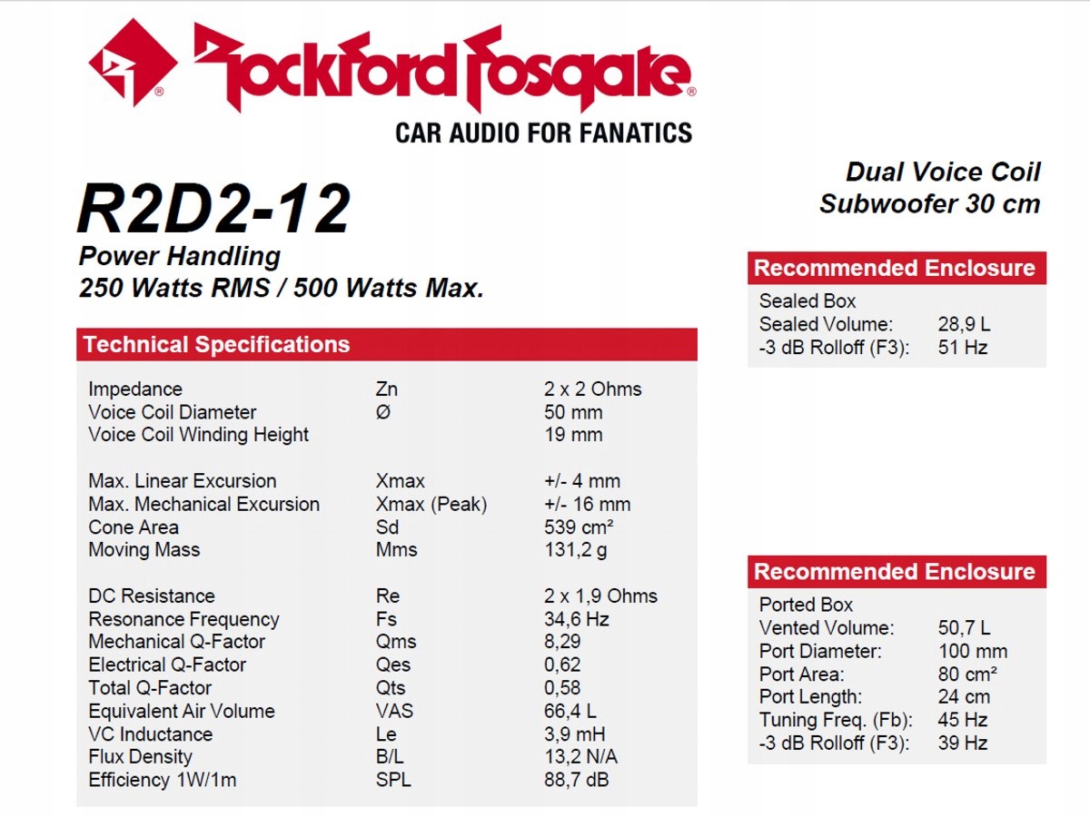 Просматривая «Rockford Fosgate R2D2-12 - Сабвуфер 30 см 250 / 500 Вт», вы можете быть уверены, что данный товар из каталога «300 мм» будет доставлен из Польши и проверен на целостность. В цене товара, указанной на сайте, учтена доставка из Польши. Внимание!!! Товары для Евросоюза, согласно законодательству стран Евросоюза, могут отличаться упаковкой или наполнением.