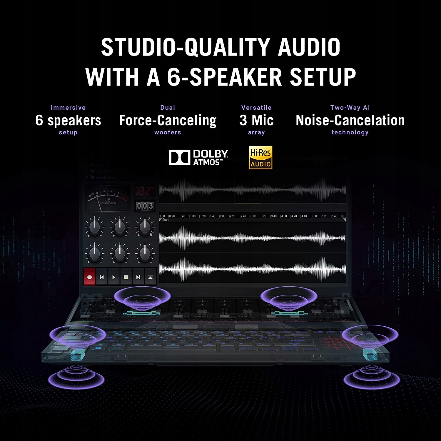Насолоджуйтесь звуком студійної якості з шести динаміків і двох низькочастотних динаміків із примусовою компенсацією. Завдяки підтримці Dolby Atmos® система може створювати віртуальну 5.1.2-канальну звукову сцену, забезпечуючи неймовірне занурення. Наші три мікрофони дають вам неймовірну гнучкість під час приєднання до дзвінків або запису аудіо за допомогою двостороннього шумозаглушення штучного інтелекту, яке фільтрує вхідний і вихідний звук. Насолоджуйтесь кришталево чистим голосовим чатом навіть у шумному середовищі.