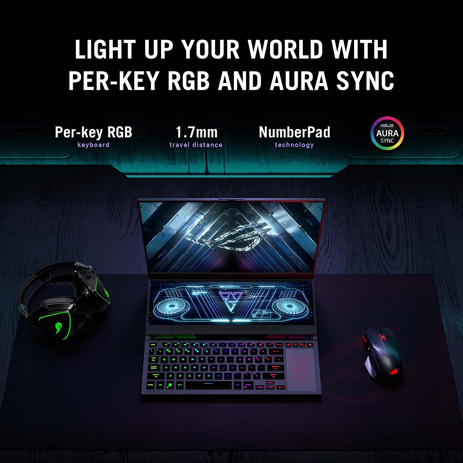 Zephyrus Duo 16 не допускає жодних компромісів. Завдяки використанню технології NumberPad трекпад також служить повнорозмірною цифровою клавіатурою, щоб збільшити простір у розділі клавіатури. Технологія N-key гарантує, що кожне натискання клавіші реєструється незалежно, що дає вам гнучкість під час гри для виконання складних комбінованих команд, а також точність для швидкого введення тексту. Довгий хід клавіш: 1,7 мм робить написання текстів на ноутбуці Zephyrus Duo 16 надзвичайно комфортним, а також мінімізує випадкові натискання клавіш. Індивідуальне RGB-підсвічування для кожної клавіші забезпечує чудові результати, використовуючи як попередні налаштування, так і персоналізовані схеми, налаштовані за допомогою Armoury Crate.