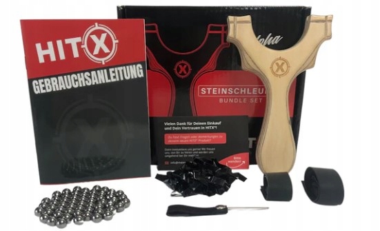 Кожна з наших рогаток постачається в зручному наборі, тож ви можете почати використовувати свою рогатку правильно геть. У набір входять дві попередньо зв'язані гумки, 100 сталевих кульок (діаметром 8 мм), 2 м гумок для версій OTT і TTF і допоміжний пристрій для закріплення гумки. Також додається посібник користувача німецькою мовою з відеоуроками.
