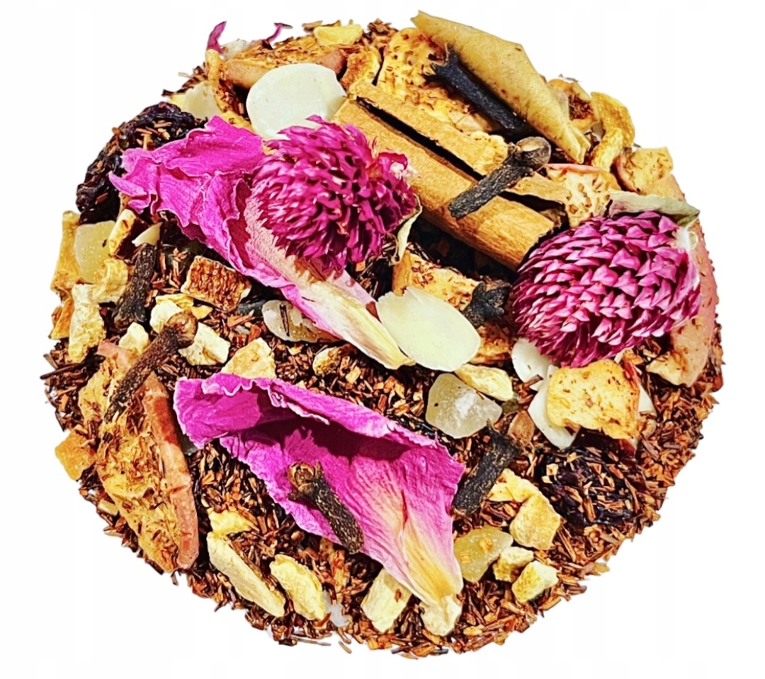 Інгредієнти: Ройбуш, сушене яблуко, кориця, мигдаль, диня, гвоздика, гомфрена.