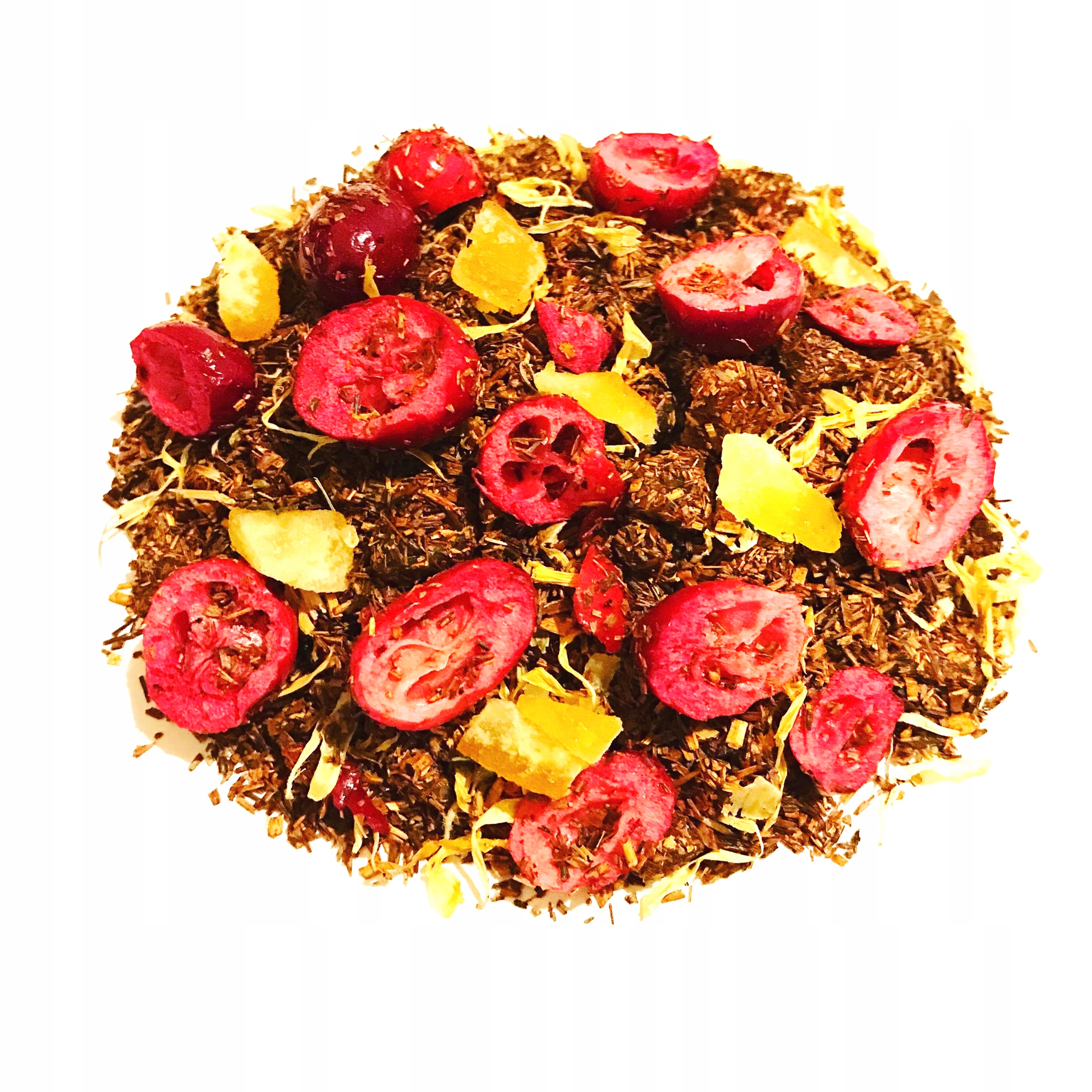 Інгредієнти: Ройбуш, свіжа та сушена журавлина, апельсинові цукати, папайя, чорнобривці, пелюстки троянди та гібіскуса.