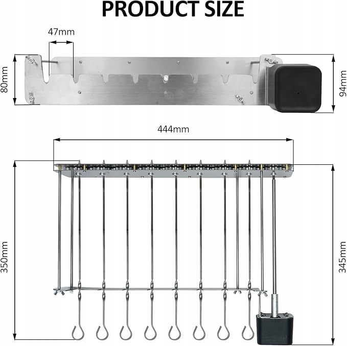 - 【Високоякісна нержавіюча сталь】 Електричний шампур виготовлено з високоякісної нержавіючої сталі, яка є стійкою до корозії, високих температур і корозії. Краї шампурів ретельно відшліфовані, гладкі та без задирок, тому вам не доведеться турбуватися про подряпини під час використання. Регульована довжина бічної пластини. На 10 рожнах достатньо місця для різноманітних інгредієнтів.