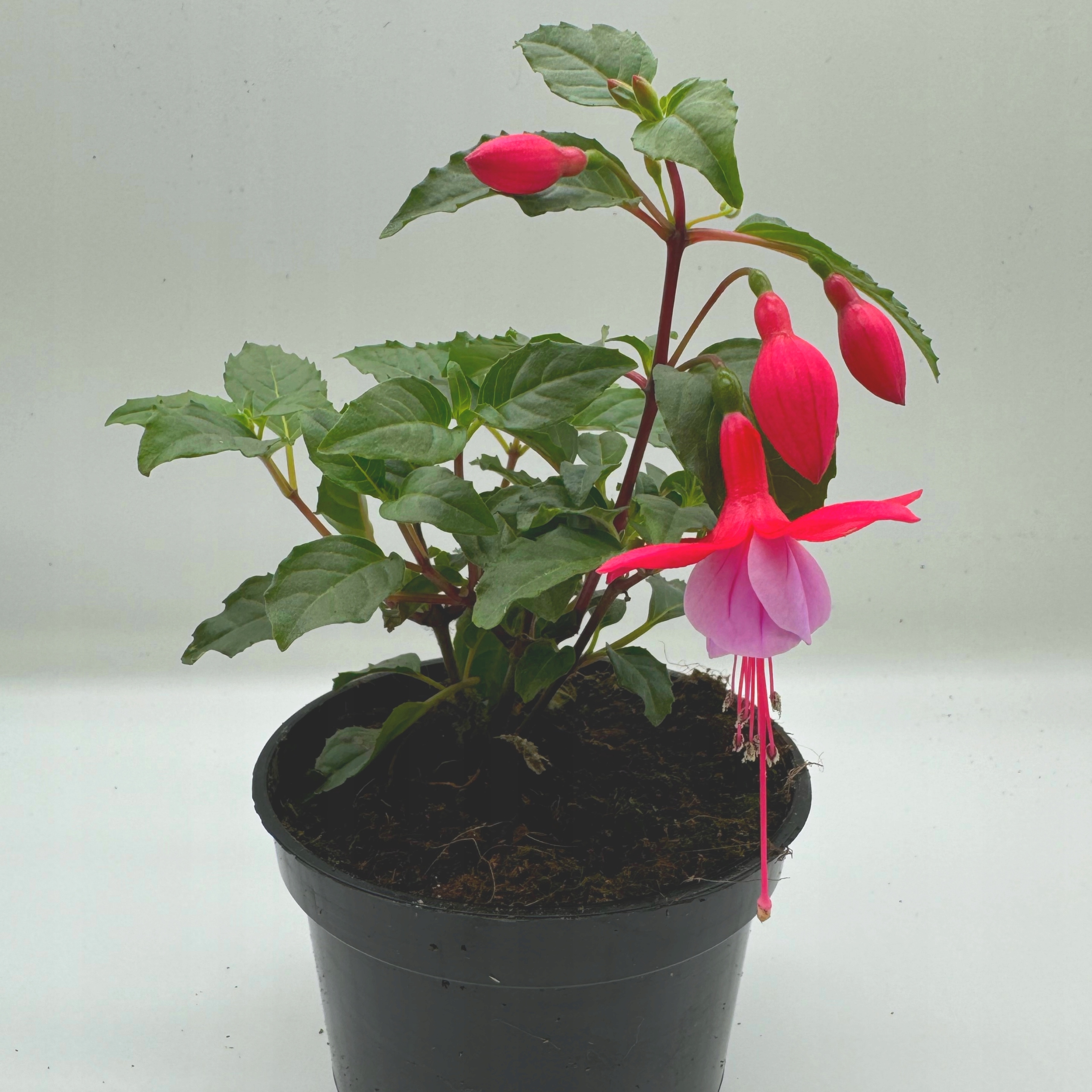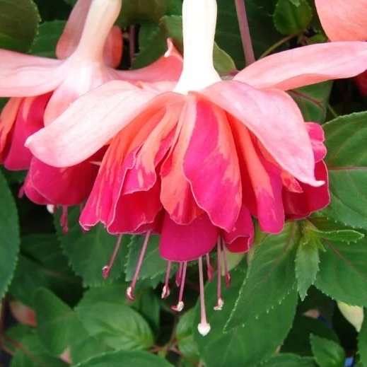 Фуксії мають характерні квіти, укладені дзвоном, які можуть бути різними кольорами, найчастіше в відтінках рожевого, фіолетового, червоного та білого. Часто зустрічаються сорти з двоколірними квітами, що ще більше підкреслює їх декоративність. Ці квіти, як правило, висять на тонких стеблах, створюючи ефект висячих каскадів кольорів. Листя фуксії еліптичні, темно -зелені та блискучі, що є приємним тлом для яскравих квітів.