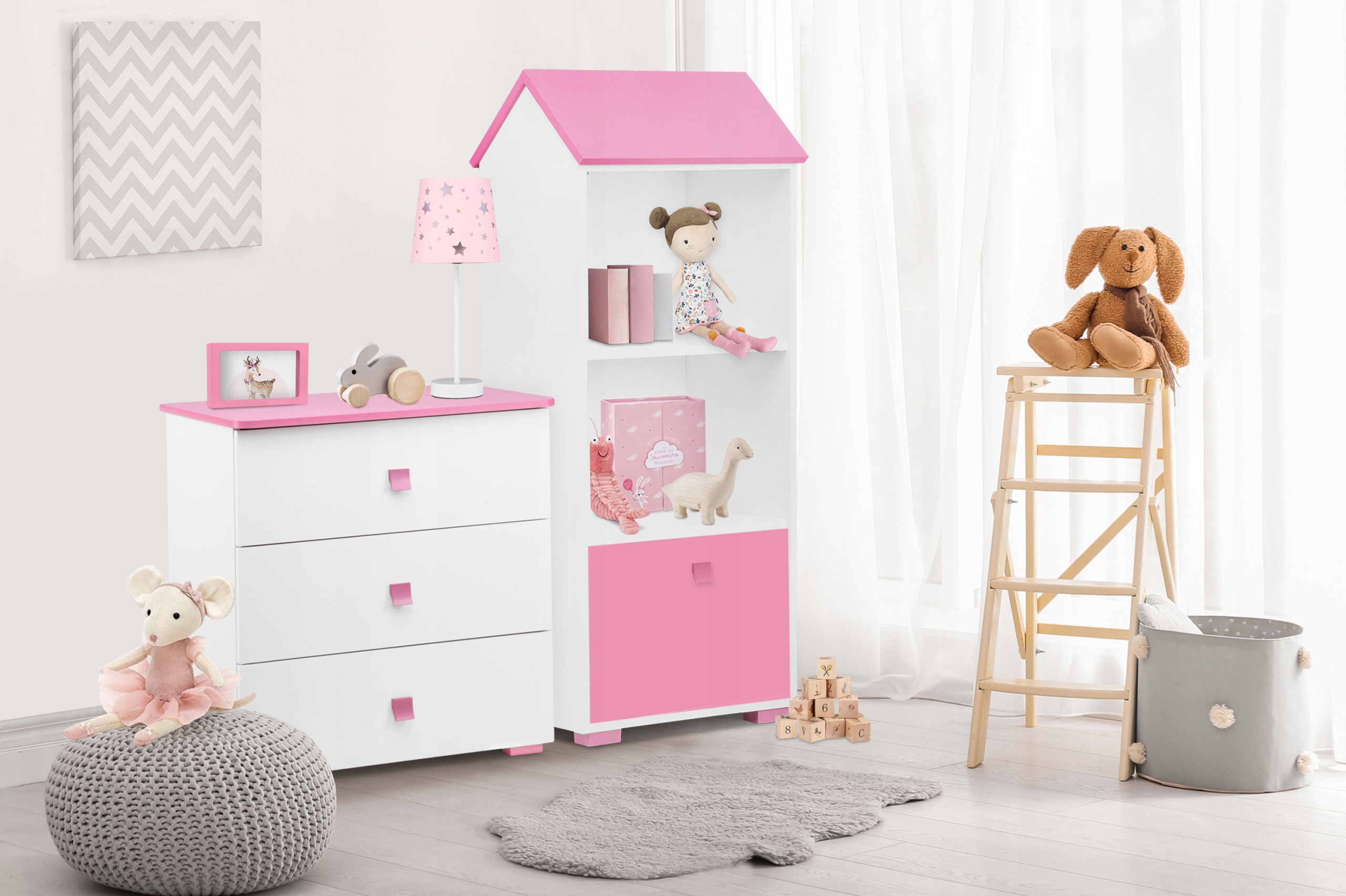62 x 130 x 30 см | 18мм ламінована дошка | колір: білий / рожевий. >полиця Дитяча з колекції PABIS ідеально доповнить дитячу кімнату. Сучасний і простий стиль білого кольору дозволить полиці легко вписатися в решту кімнати. Крім того, завдяки кольоровому даху Pabis набуває казкового вигляду, що робить його елементом повсякденної гри. Вмісткі полиці дозволять розставити дитячі іграшки, книги та інші речі, пов'язані з дітьми. Стелаж Pabis - гарне рішення в дитячій кімнаті, яке допоможе підтримувати порядок навколо маленьких користувачів і чудово поєднується з іншими елементами колекції.