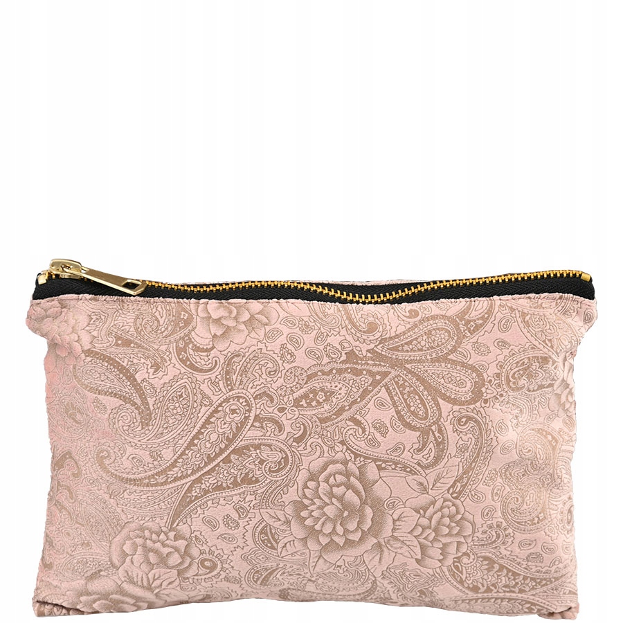 Косметичка прямокутної форми з матеріалу світло-рожевого кольору з тисненням. Його можна використовувати як косметичку або як органайзер для нашої сумочки для найважливіших речей. Але ви також можете використовувати його у своєму гардеробі для зберігання улюбленої білизни. Косметичка має основне відділення, що застібається на блискавку. Чудово виготовлено.