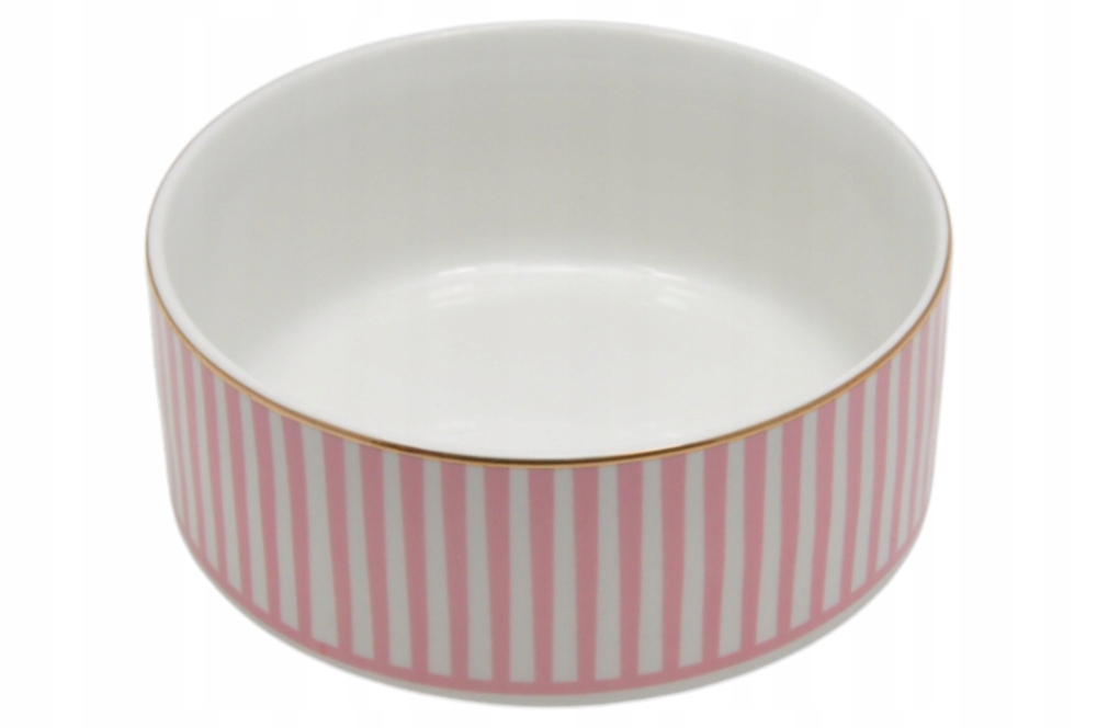 Зовнішня частина чаші прикрашена симетричним малюнком делікатних, вертикальних смуг у тонкому відтінку рожевого, що нагадує спокійну витонченість скандинавської конструкції. Ціле увінчане золотим краєм.