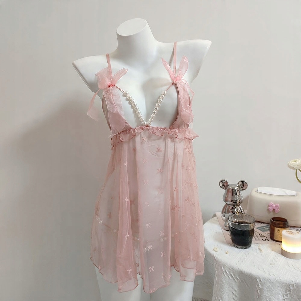 Рожева сексуальна жіноча еротична нічна сорочка з перлами + трусики