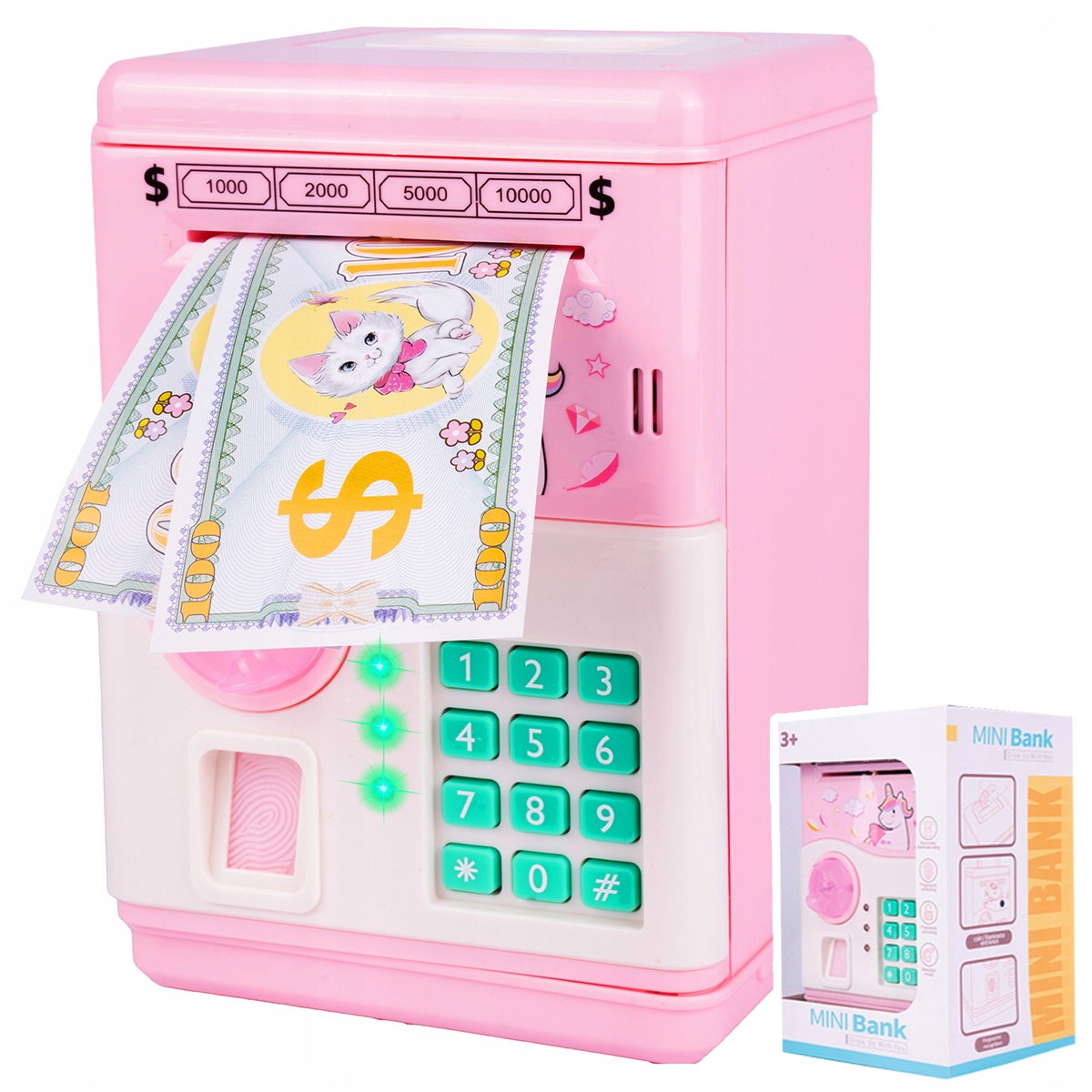 Рожева скарбничка. Інтерактивний безпечний PIN-код для банкнот. Монети. Світлодіодний банкомат