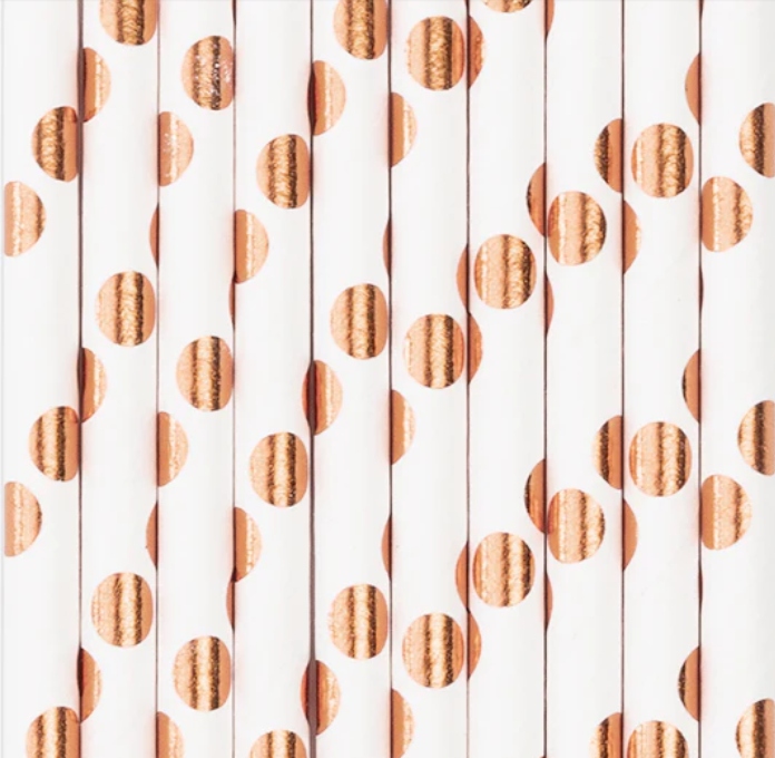 паперові соломки в рожево-золотих горошок, прямі, упаковка 10 штук. Довжина 19,5 см, діаметр прибл. 7 мм.
