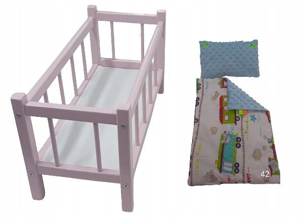 рожеве дерев’яне ліжечко з набором постільної білизни