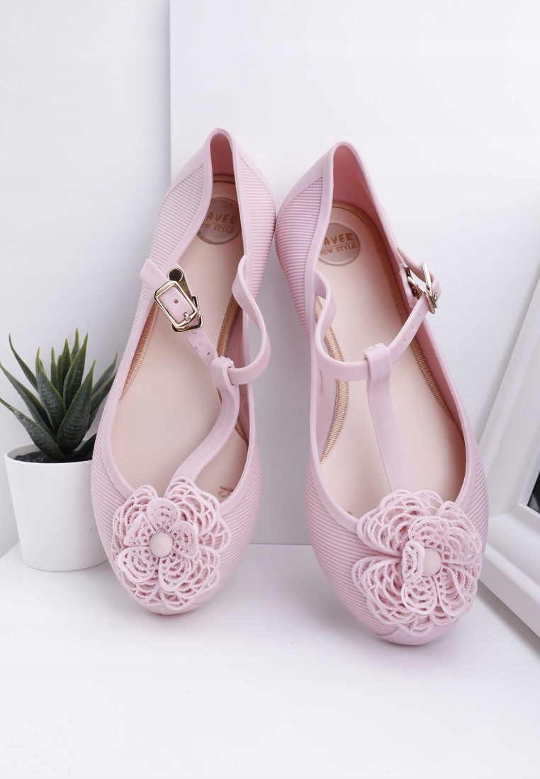 Балеринки типу Meliski, на плоскій підошві, повністю з гумового матеріалу. Застібається на вузький ремінець із золотою пряжкою. На передній частині черевика є декоративна аплікація у вигляді квітки. Модель ідеально підходить як для повсякденного використання, так і для пляжу.