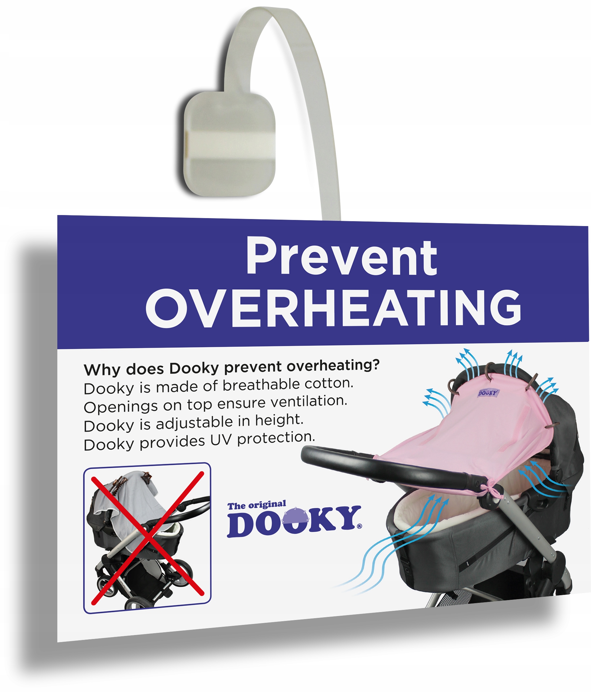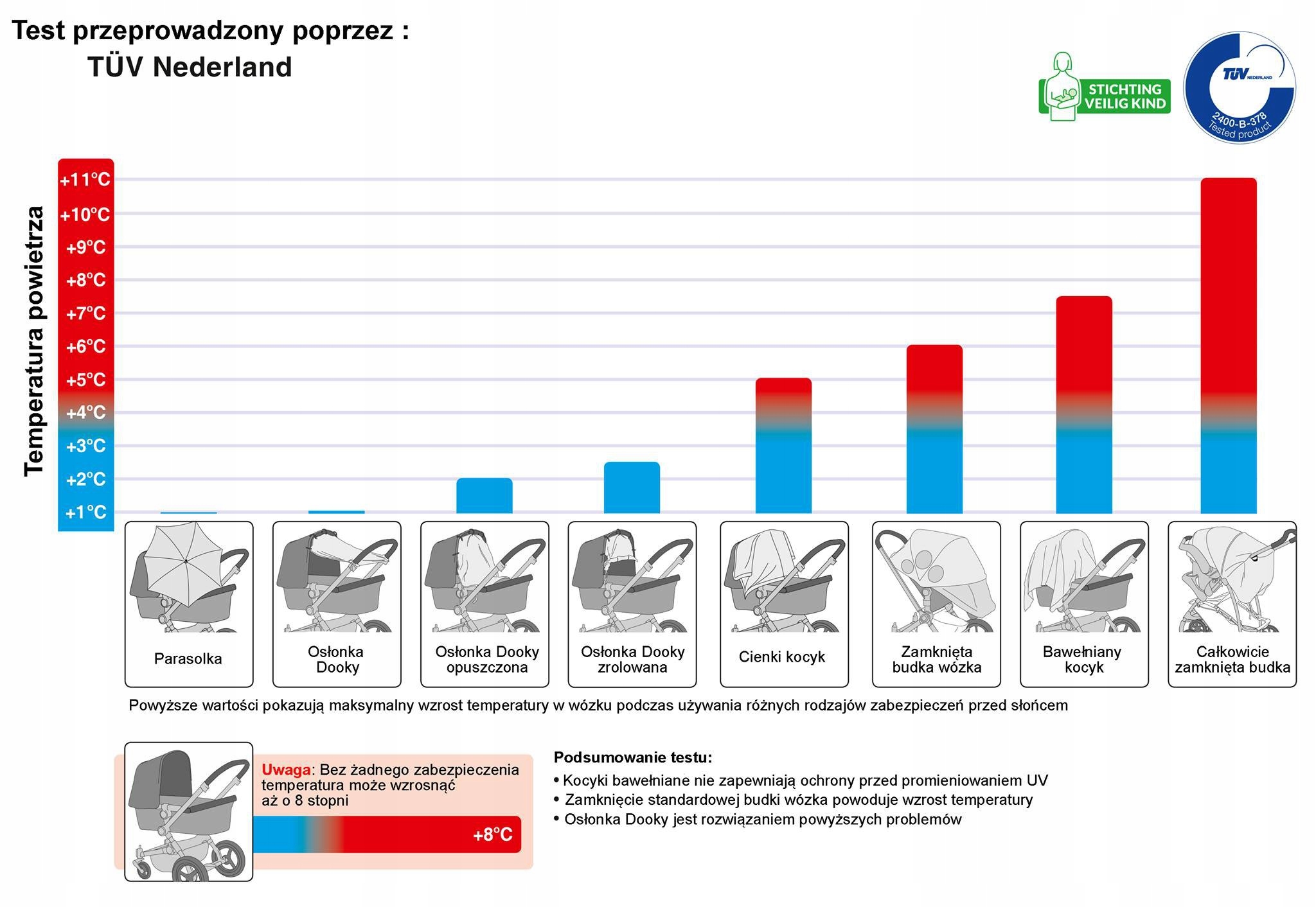 Ми хочемо пояснити вам, чому обкладинка Dooky є безпечною, а деякі "рішення", мабуть, ні. Правильно встановлений Dooky Covi забезпечує подих та адекватну циркуляцію повітря, який підтримується наступними тестами, виконаними сертифікаційним блоком TUV Netherlands. Ми не покриваємо його кабінкою, а прикріплюємо кришку даху гнучкими гачками. З кожної сторони у нас є подих, тому ми не перегріваємо малюка. Крім того, кришка має УФ -фільтр, який захищає від спалювання.