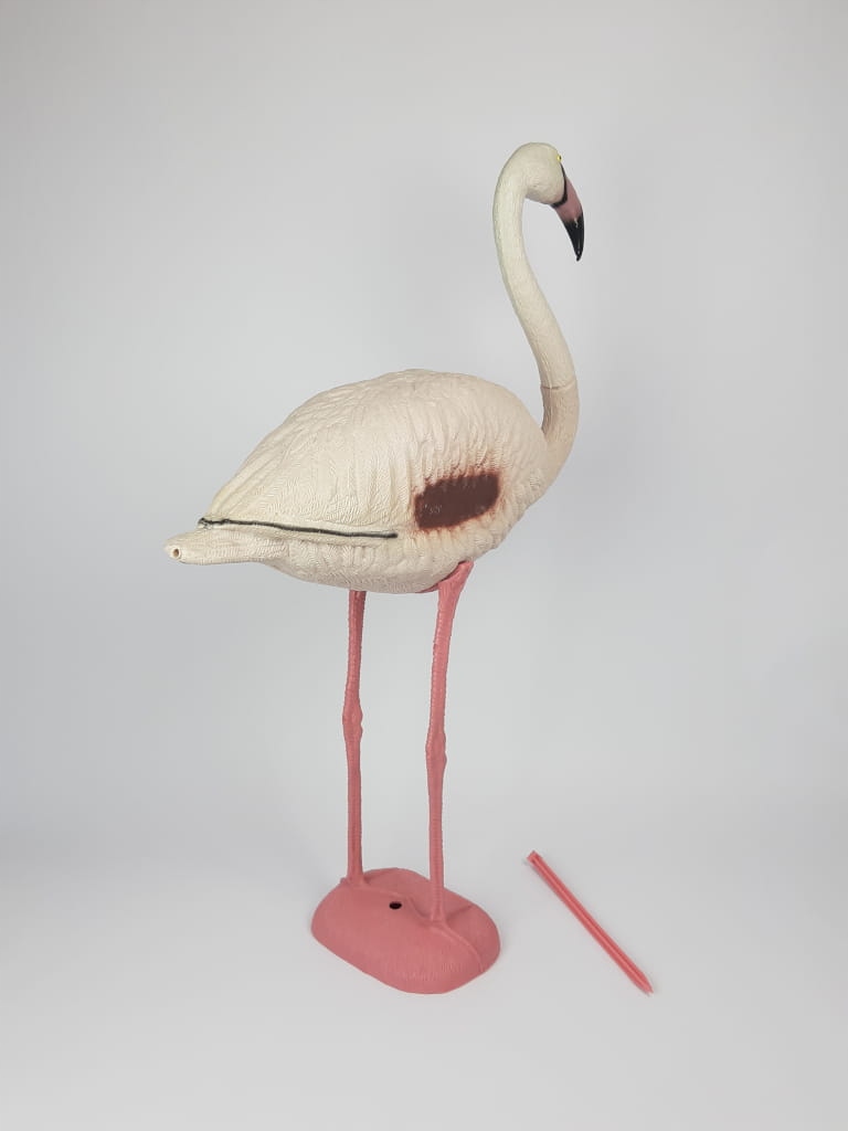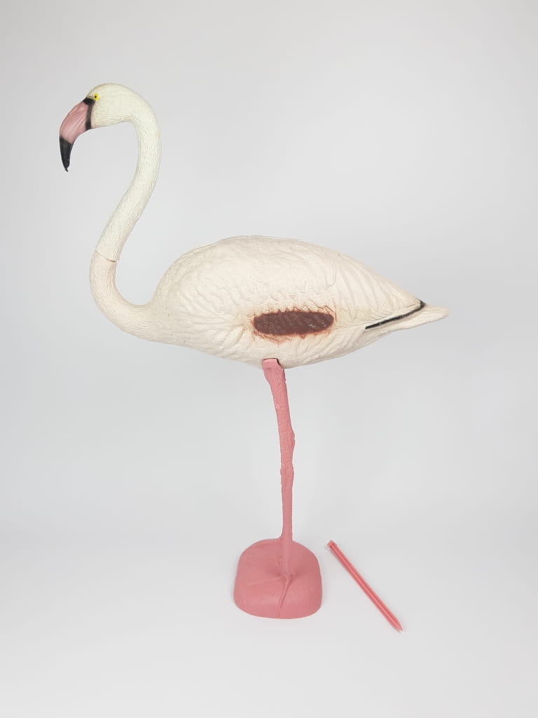 Рожевий фламінго виготовлений з високоякісного пластику, стійкого до УФ -випромінювання та декоративної фігури води. Продукт був зроблений дуже обережно, щоб колір і зовнішній вигляд близький до природного. Тому це імітує оригінальну птицю. Це виглядає красиво не тільки над водою, але і серед рослинності. Тому він диверсифікує кожне око і буде цікавою прикрасою протягом багатьох років. Крім того, він буде використаний на весіллях, заходах компанії та в кінотеатрі чи театрі, де вони будуть цікавим сценографією. Оскільки основа ніг не забезпечує повної стабільності прикраси, для стабілізації фігури було прикріплено шпильку.
