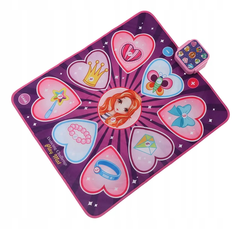 Килимок для аркадних танців чудово поєднує в собі гімнастику з чудовою розвагою. Завдання гравців - покласти руки або ноги на предмет на килимку, який вказує панель управління. На лівій бічній панелі є кнопка, за допомогою якої можна вмикати і вимикати іграшку. Килимок має регулятор гучності та кнопку «гра», за допомогою якої можна запускати гру та вибирати індивідуальні рівні. Кожен режим гри підвищує свій рівень складності. Килимок автоматично переходить у режим сну через 3 хвилини.