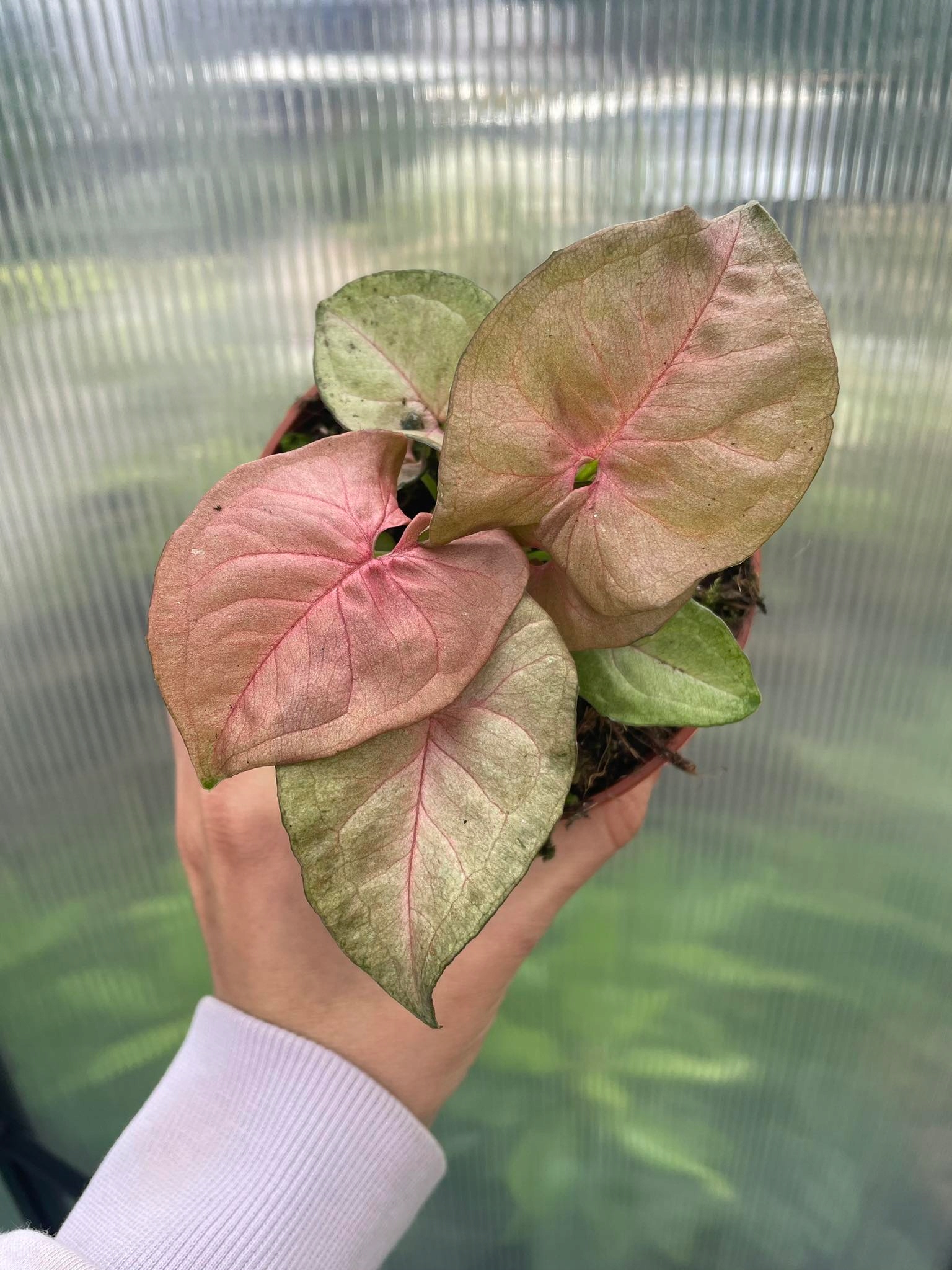 Красивий інтенсивно-рожевий сингоніум - безпроблемна рослина для кожного любителя рожевого листя <3