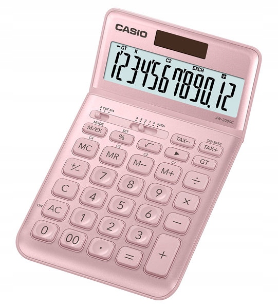 Офісний калькулятор CASIO Stylish серії JW.-200SC-PK - металевий корпус, дисплей із можливістю нахилу, обчислення податків (TAX), конвертація валют, подвійне живлення. Великий чіткий 12-значний дисплей