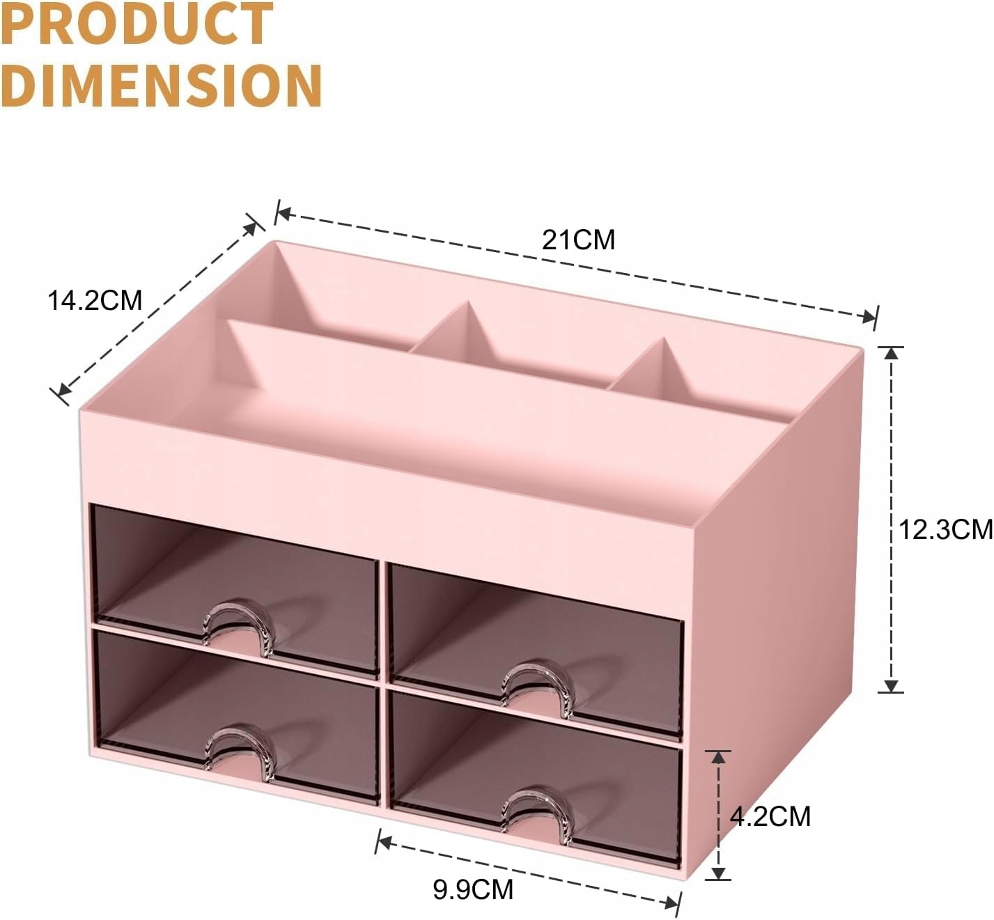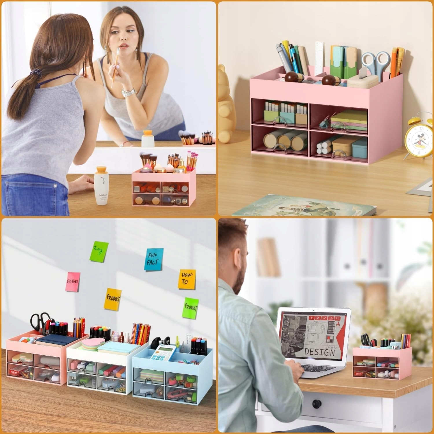 - Організатор оснащений 4 відділеннями та 4 прозорими ящиками, щоб ви могли організувати та зберігати свої повсякденні речі. Наприклад, ручки, ножиці, самостійні картки тощо -найкращий вибір для збереження столу в чистоті та замовлення. 4 Для зберігання різних офісних матеріалів, але його також можна використовувати як організатор для косметики. Ви можете поставити помаду, гребінці та інші повсякденні предмети.