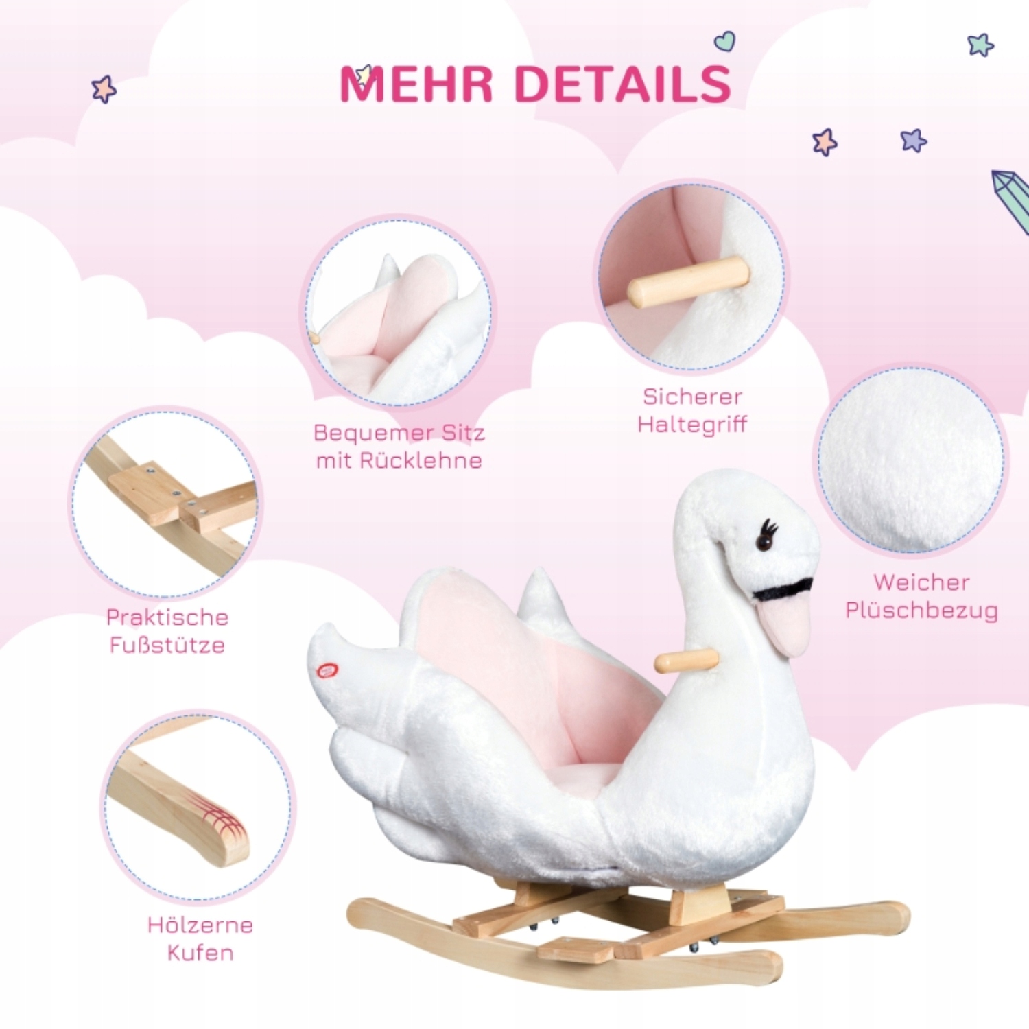 м'які та доброзичливі: качанна тварина покрита м'яким, плюшевим рожевим та білим матеріалом і має форму лебедя.