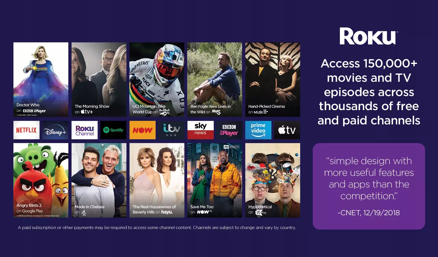 Легко знаходьте, де транслювати фільми та шоу безкоштовно або за найнижчою ціною, завдяки об’єктивним результатам, упорядкованим за ціною, у Roku Search. Платіть лише за те, що хочете, коли хочете, без щомісячної плати за обладнання чи прихованих платежів.