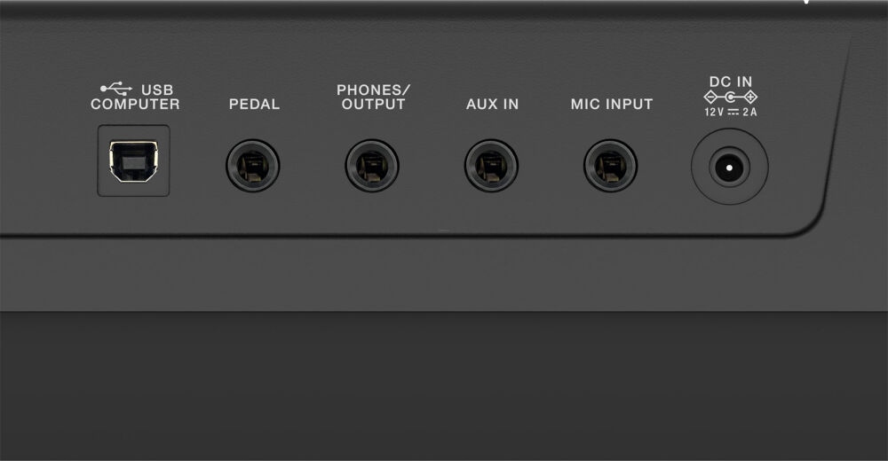 • Роз’єми: роз’єм PHONES/OUTPUT: 1/4-дюймовий стерео, роз’єм AUX IN: 1/4-дюймовий стерео, роз’єм MIC INPUT: 1/4-дюймовий TRS, роз’єм PEDAL: 1/4-дюймовий, порт USB КОМП’ЮТЕР: USB B, DC IN
