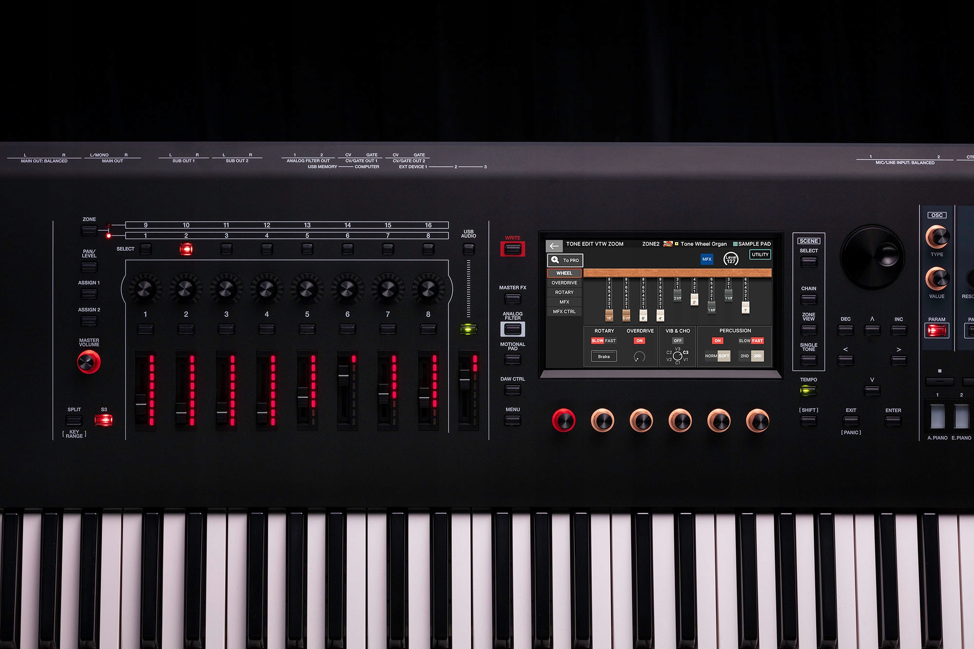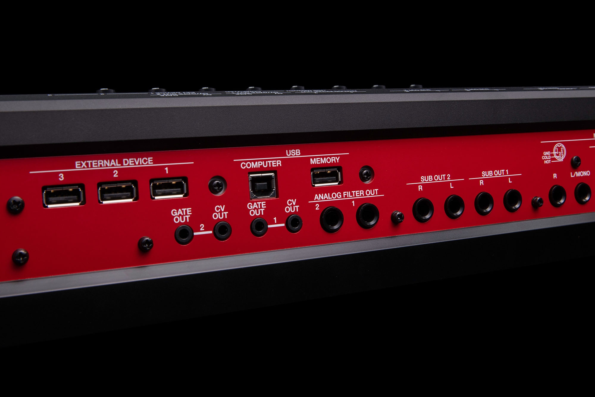 Заповнена задня панель FANTOM EX підтримує підключення до широкого діапазону обладнання. Є комбіновані роз’єми XLR для мікрофонів та інструментів, а також вісім 1/4-дюймових виходів для маршрутизації звуків у зовнішні місця призначення. MIDI I/O та подвійні виходи CV/Gate також доступні для керування модульними та аналоговими синтезаторами.