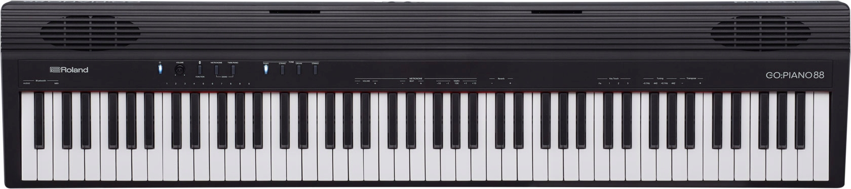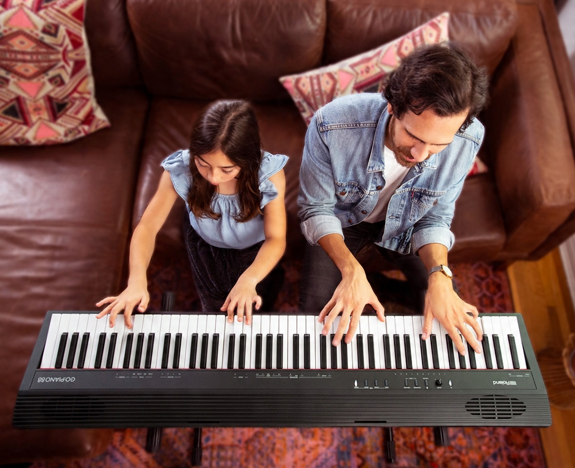 Коли ви навчаєтеся грі на фортепіано, 88 клавіш мають велике значення. Менші 61 або 76-клавішні клавіатури легше транспортувати для молодших користувачів, тоді як повнорозмірна 88-клавішна клавіатура дозволяє правильно розвивати техніку та виразніше грати. Більшість клавіатур змушують вас вибирати між якістю та компактністю, але Roland GO:PIANO88 дає вам і те, і інше. Легкий і готовий до подорожей, з додатковим акумулятором і навушниками, GO:PIANO88 має повнорозмірну 88-нотну клавіатуру та звучить прямо з найкращих цифрових піаніно Roland, тож ви можете грати з правильною технікою та експресією, що важливо для класичної музики. або більш складні частини. GO:PIANO88 також має вбудовані Bluetooth колонки, які в поєднанні зі смартфоном стають чудовим рішенням для навчання. Підключившись, ви зможете почати відкривати для себе безкоштовний онлайн-контент, який зробить навчання швидшим і веселішим - з онлайн-уроками фортепіано, караоке, підручниками для ваших улюблених пісень - і ви можете транслювати свій список відтворення та грати разом. Знайдіть місце, візьміть смартфон і розпочніть свою музичну пригоду з GO:PIANO 88.