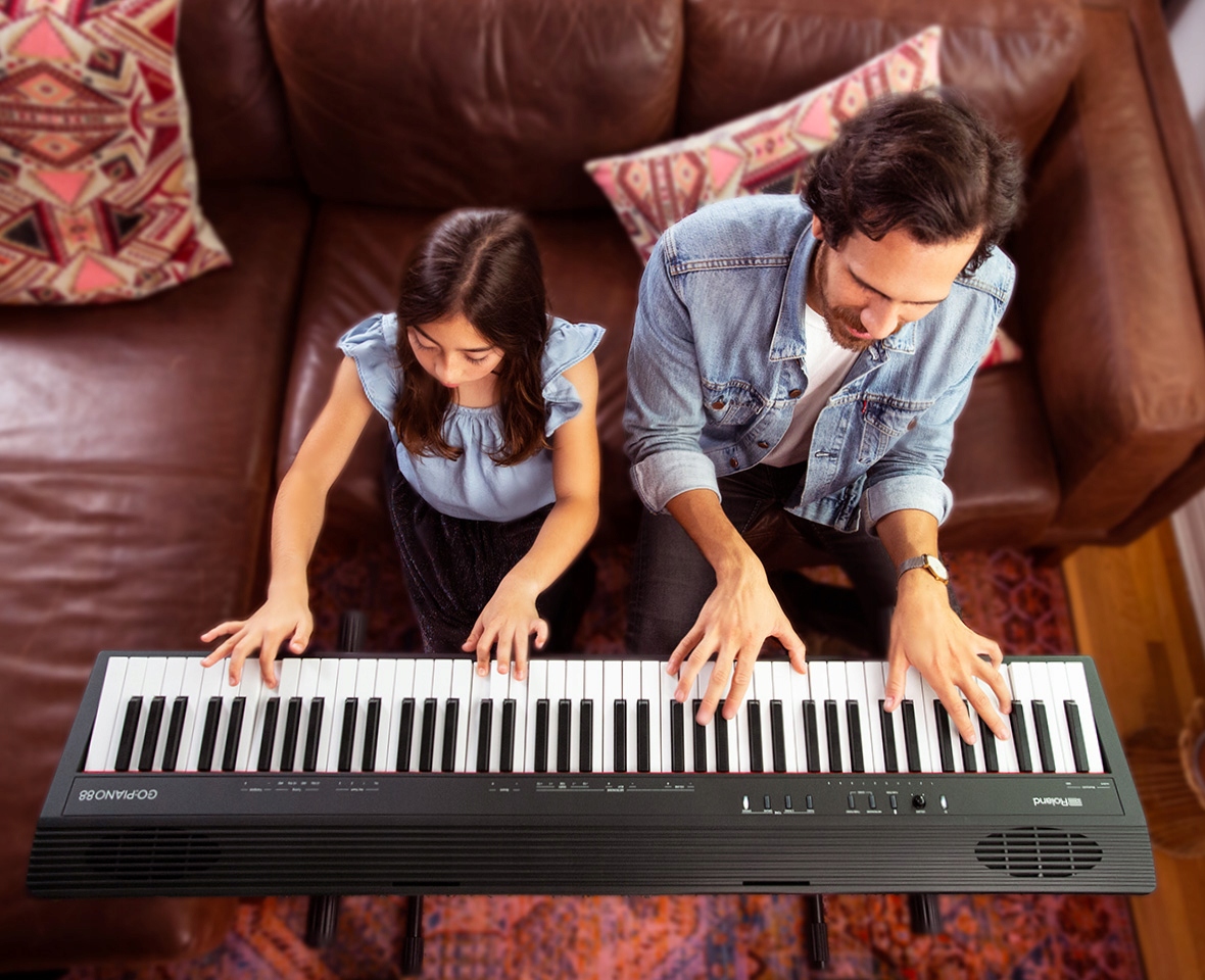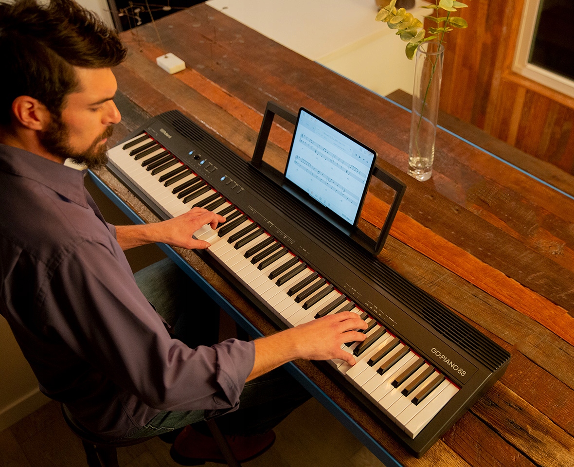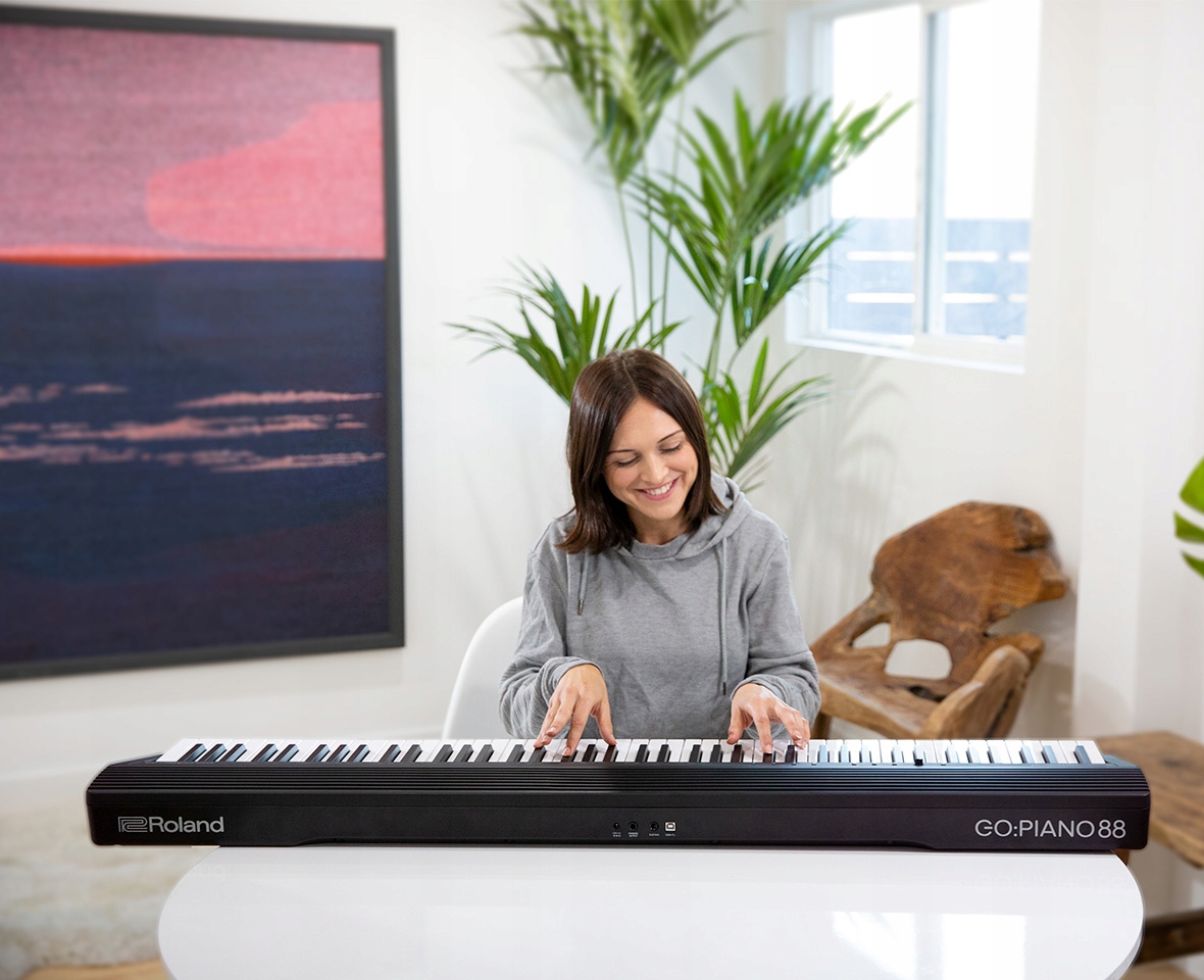 Якщо ви оціните повнорозмірну 88-клавішну клавіатуру GO:PIANO88, вас також надихне вибір вбудованих звуків, отриманих від цінних піаніно Roland. Торкайтеся клавіш, і ви почуєте характерні звуки, які плавно змінюються у відповідь на ваш дотик, як тонкий акустичний рояль. На додаток до виразної клавіатури, GO: PIANO88 забезпечує динамічну гру, заохочуючи вас вдосконалюватися швидше в міру зростання ваших навичок. GO: PIANO88 також містить звуки електронного фортепіано, звуки органу та багато іншого, щоб досліджувати різні стилі