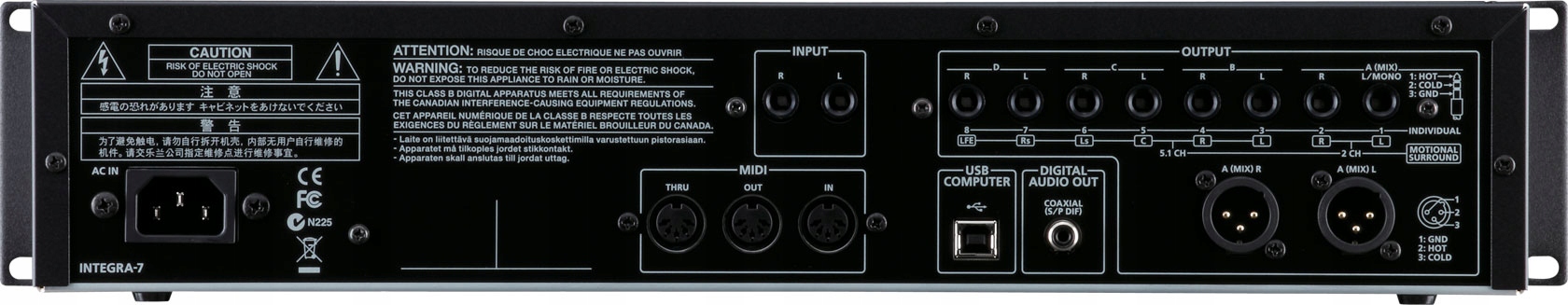 На передній панелі INTEGRA-7 є спеціальні кнопки для швидкого доступу до звуків і ефектів, а також велике коло, оточене навігаційними клавішами. Чітко видимий РК-дисплей має регулювання контрастності для адаптації до умов освітлення та кута огляду. На задній панелі є універсальні роз'єми, включаючи стереовиходи XLR, вісім окремих 1/4" телефонних виходів, цифровий вихід (коаксіальний), MIDI in/out/thru та порт USB для потокового аудіо з 24-бітною дискретизацією. /96 кГц Для зручності та гнучкості входи роз’ємів розташовані як на передній, так і на задній панелях.