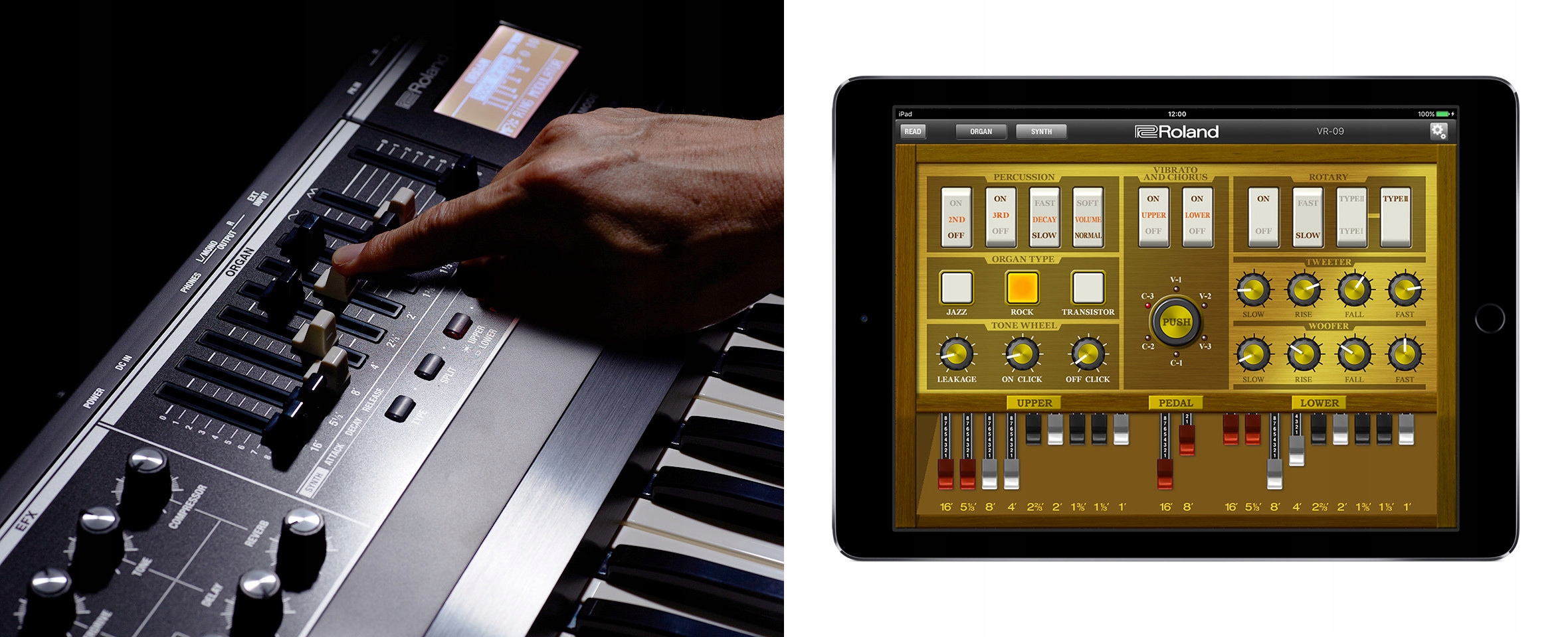 Звук управління тоновими органами колеса завершено в діапазоні 3 клавіатур, як у справжньому Хаммонді. Ви можете розділити клавіатуру на 2 частини та підключити через клавіатуру MIDI або призначити її функції лівої руки. 9 протягують (повзунки) діють у динамічному масштабі точно як аналоговий інструмент. Доступні незамінні функції ударних, модуляція/хорус, обертання, овердій. Це не штучні ефекти. Як завжди, Роланд надійно копіює реальні звуки, не зберігаючи на зразках, відтворює звук реальних ефектів з усіма деталями та ароматами. Повні та зручні елементи керування пропонуються редакційною програмою для iPad.