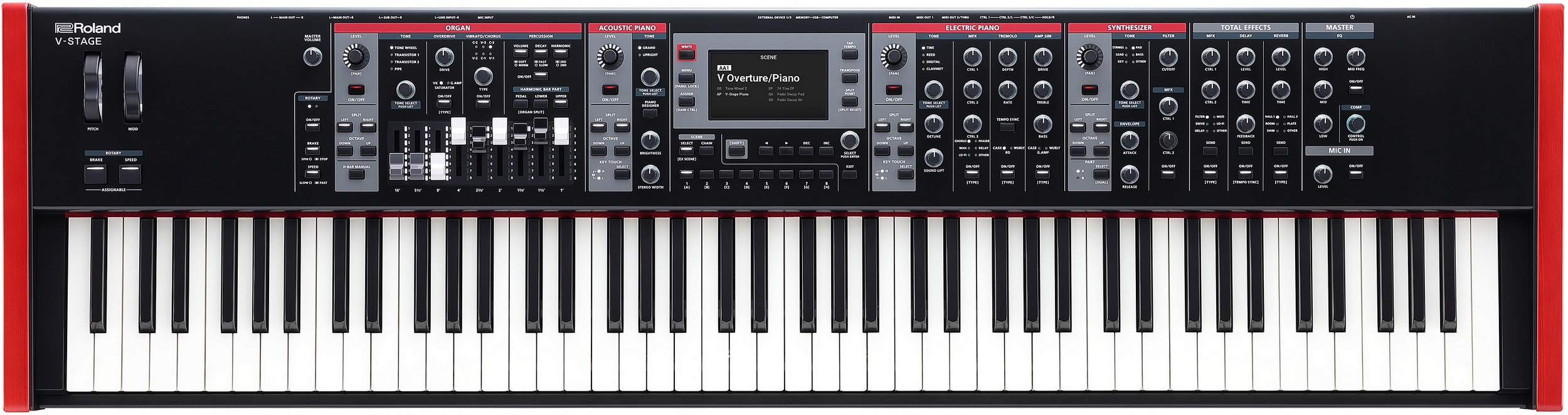 - Дві моделі: V-STAGE 88 з 88 зважених молоточкових клавіш і V-STAGE 76 із 76 напівзваженими клавішами-водоспадом у стилі органу.