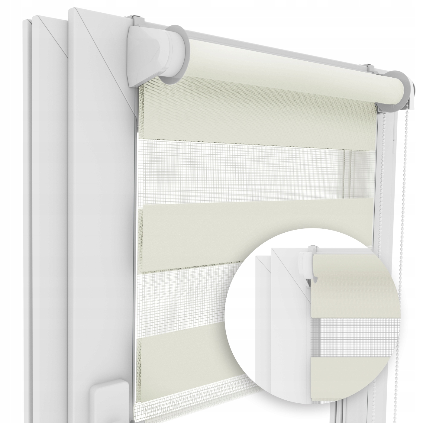 Кожна ролетна штора оснащена надійним самогальмуванням. механізм START&STOP®, який утримує штору на місці, навіть якщо вона не повністю розгорнута. Крім того, кожна рулонна штора оснащена натягувачем ланцюга та бічним натягом тканини. Механізм дозволяє кріпити ланцюжок з лівого або правого боку рулонної штори.