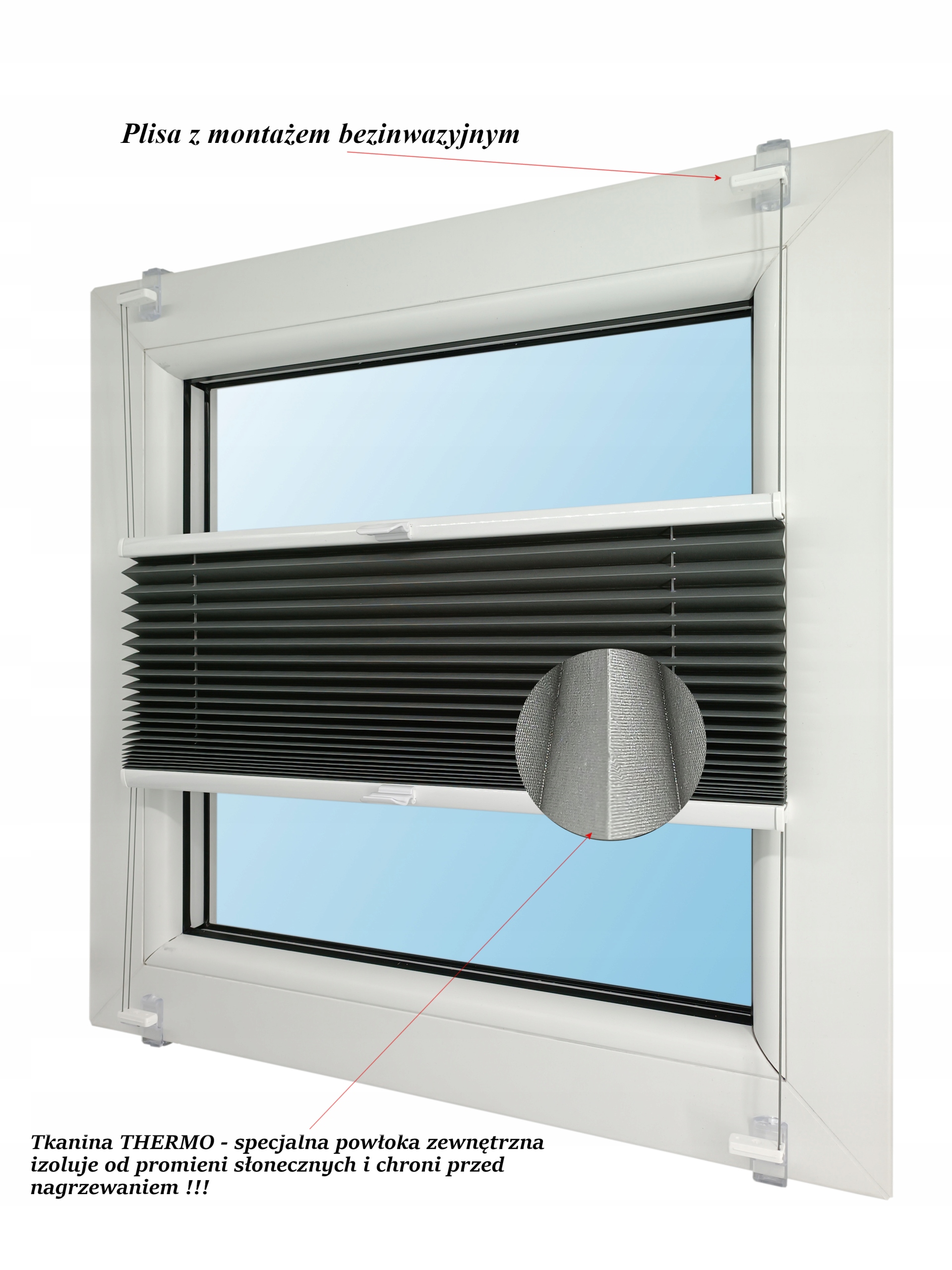 Плісе THERMO забезпечує ефективний захист приміщень від інтенсивного сонячного світла. Тканина THERMO характеризується щільним переплетенням і спеціальним зовнішнім покриттям, яке ізолює від сонячного світла, ідеально його відбиває і запобігає нагріванню приміщення! Це унікальна модель тканини!