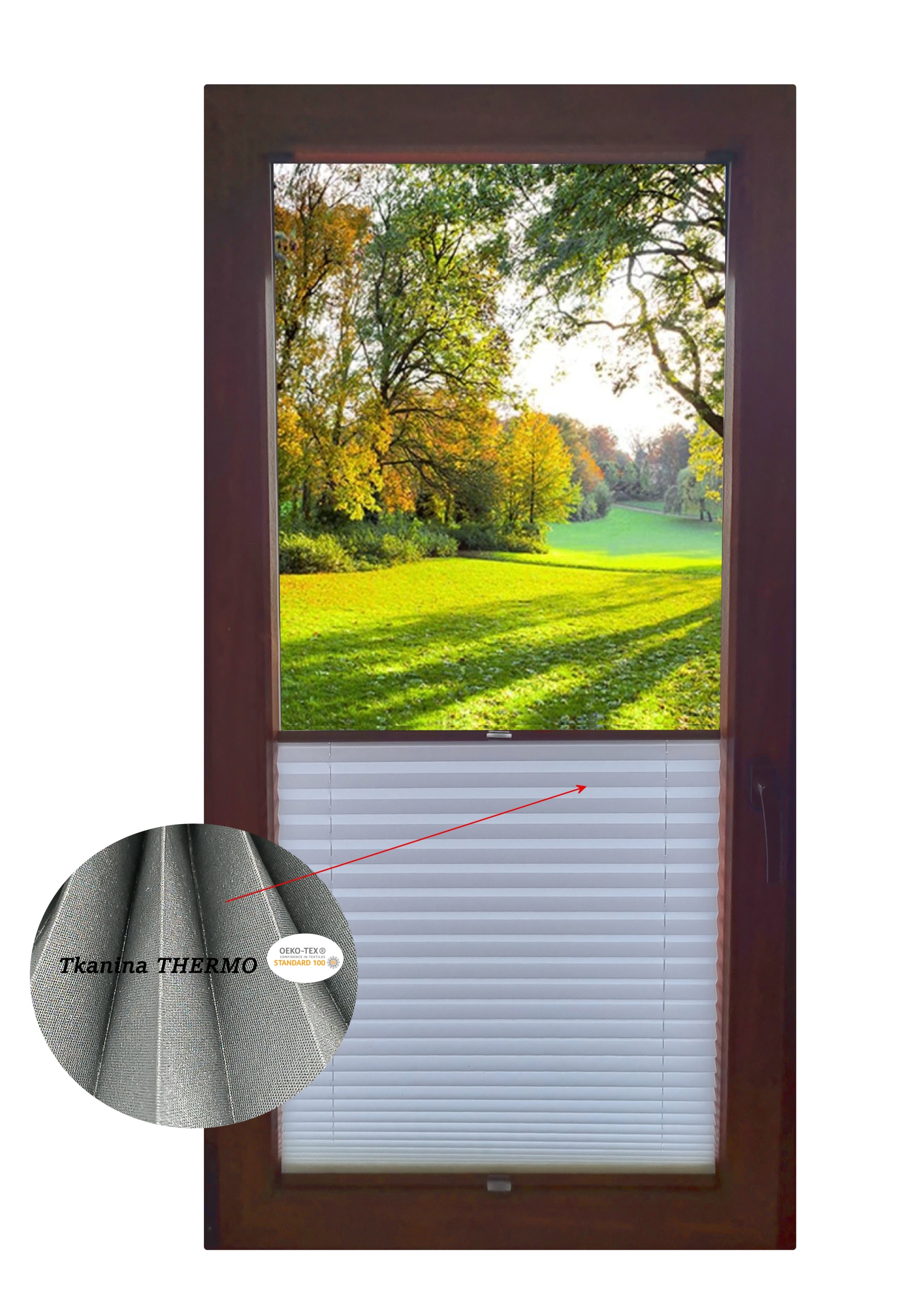 Плісе THERMO забезпечує найефективніший захист приміщень від інтенсивного сонячного світла. Тканина ТЕРМО характеризується щільним переплетенням і спеціальним зовнішнім покриттям, яке ізолює від сонячного світла, ідеально його відбиває і запобігає нагріванню приміщення! Це унікальна модель тканини!